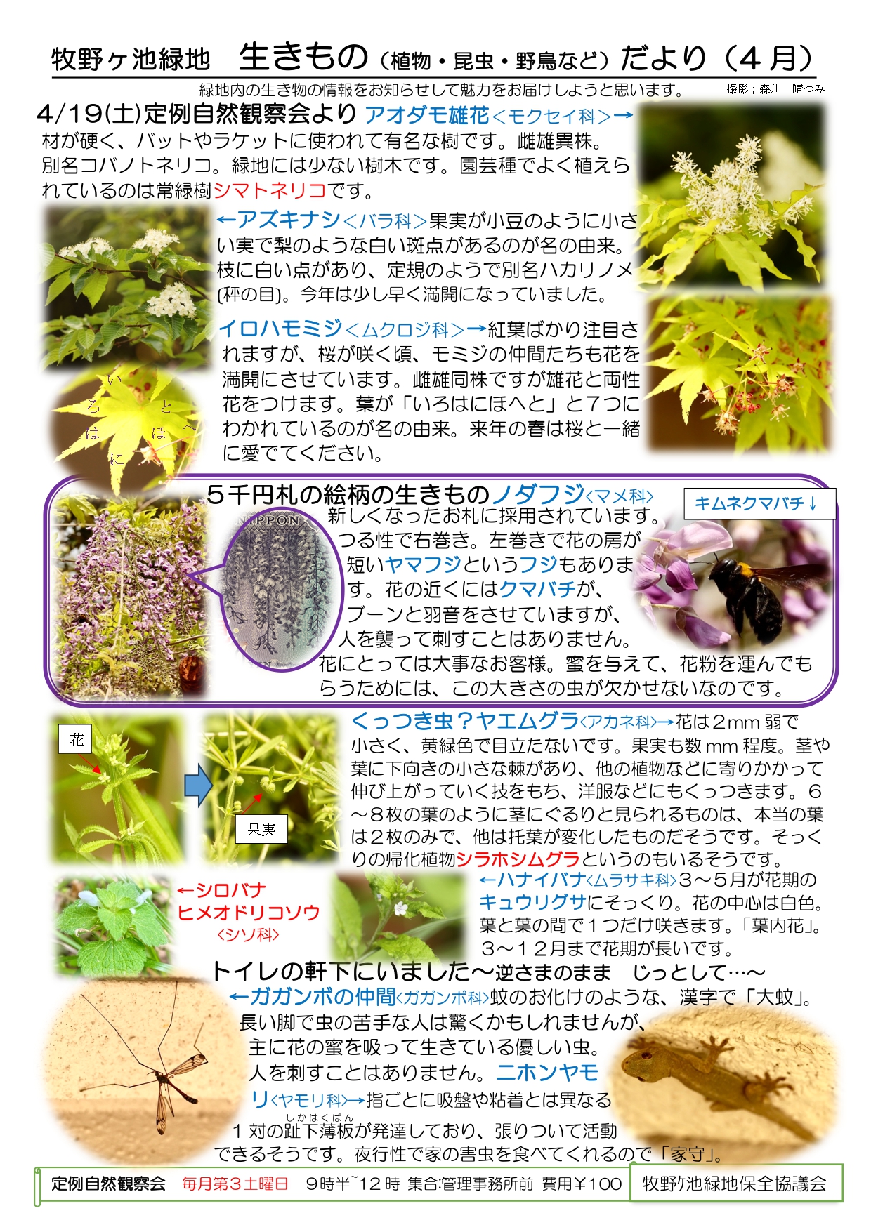 【お知らせ】牧野ケ池緑地 生きものだより(令和7年4月) 更新日 2025/05/15 牧野ケ池緑地 生きものだより(令和7年4月)が届きました。 こちらは、牧野ケ池緑地保全協議会の方々により作成されています。