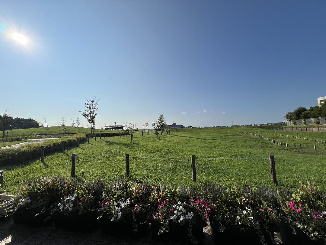 暑い日が続きますね。事務所前から見た朝の公園風景です。