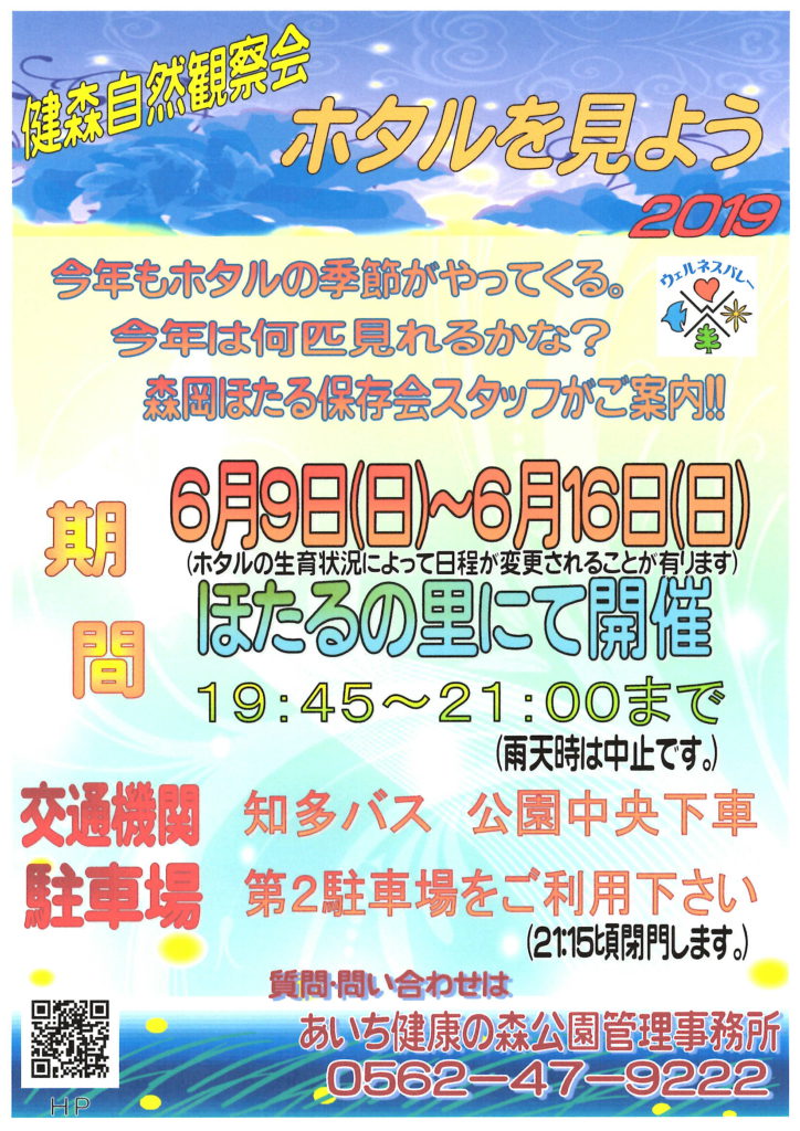 健森自然観察会 ほたるをみよう 2019 6月9日(日)~6月16日(日) 19:45 ~ 21:00 (雨天時は中止) (ホタルの生育状況によって日程が変更されることがあります) ※鑑賞会場ではフラッシュ等厳禁 EPSON MFP image