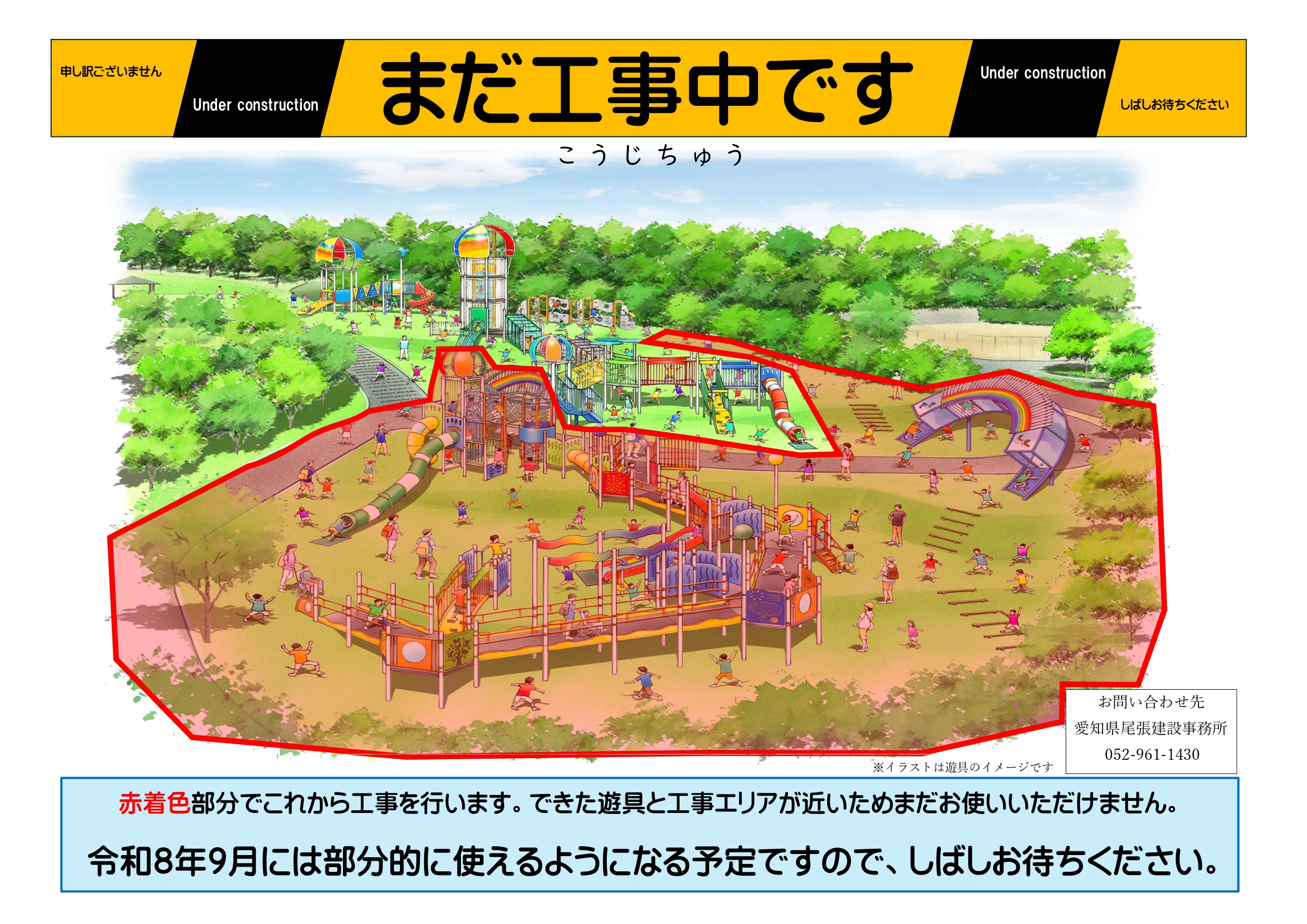 【お知らせ】ぼうけん広場およびその周辺の工事のお知らせ 更新日 2025/11/20 ぼうけん広場とその周辺で行っております工事は、引き続き、遊具の設置等の工事に入ります。そのため、令和8年9月末(一部利用可能見込)まで、ぼうけん広場(ぼうけん広場児童園を除く)のご利用ができません。 工事周辺において立入禁止や通行規制となるエリア、園路があります。多目的広場をご利用される方は芝生広場C側からお入り願います。 ご不便をおかけしますが、ご理解とご協力をお願いいたします。