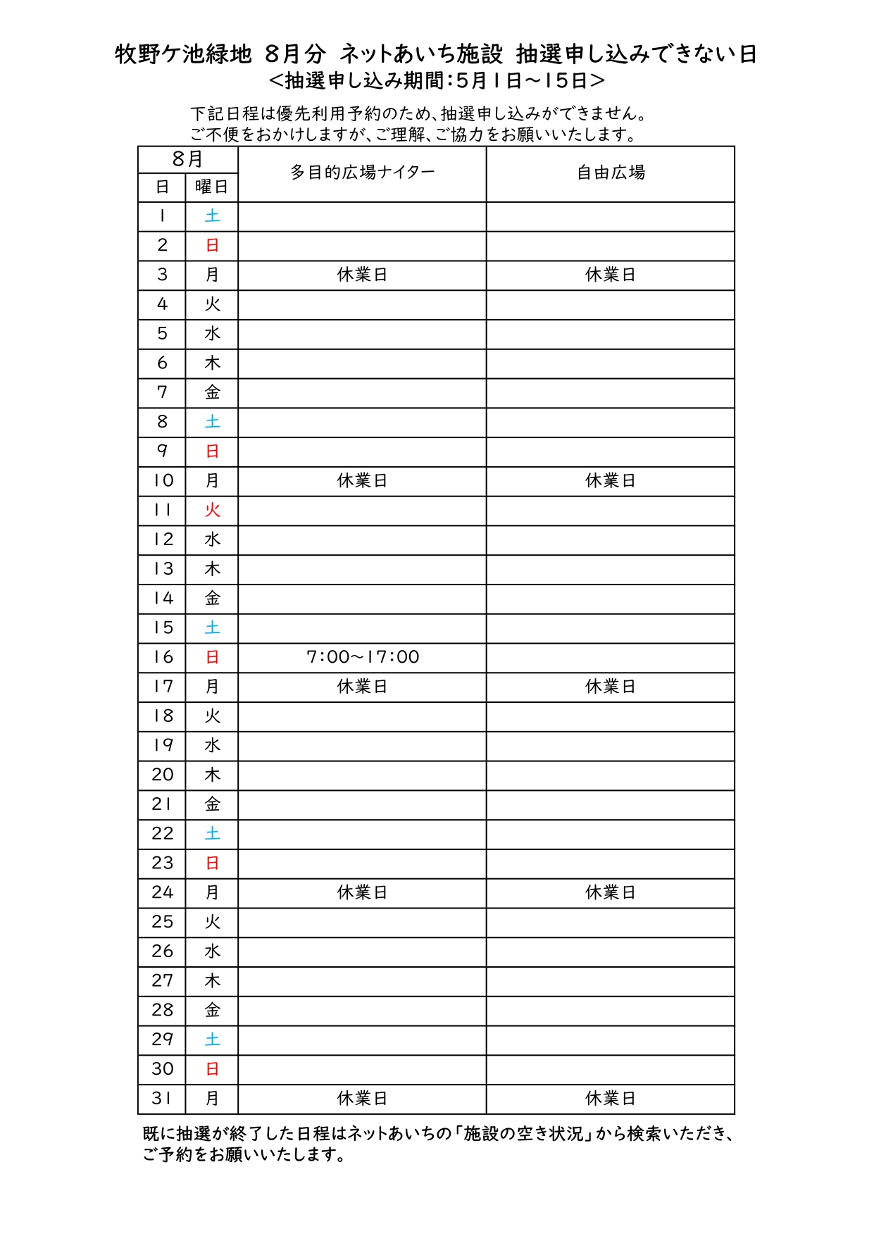 【お知らせ】令和8年8月分 ネットあいち施設 抽選申込みできない日