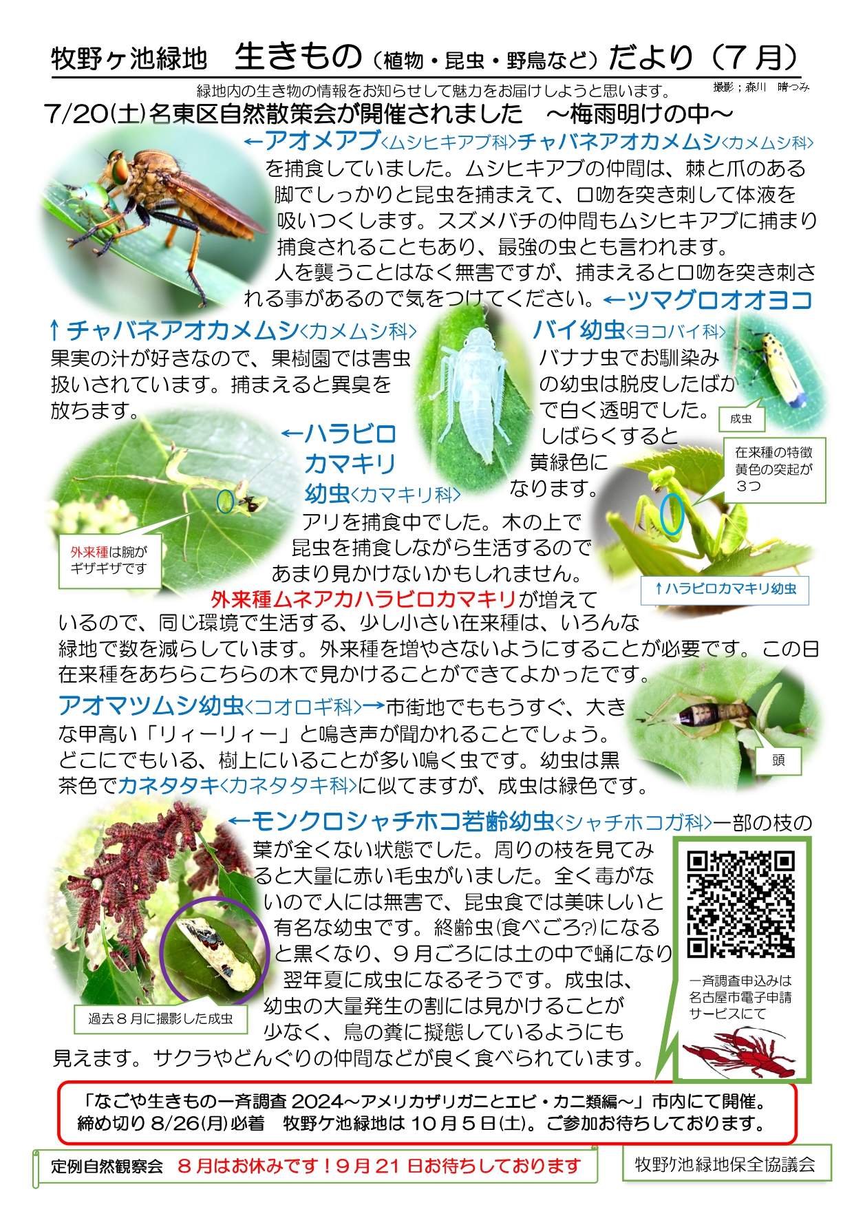牧野ケ池緑地 生きものだより(令和6年7月)が届きました。
