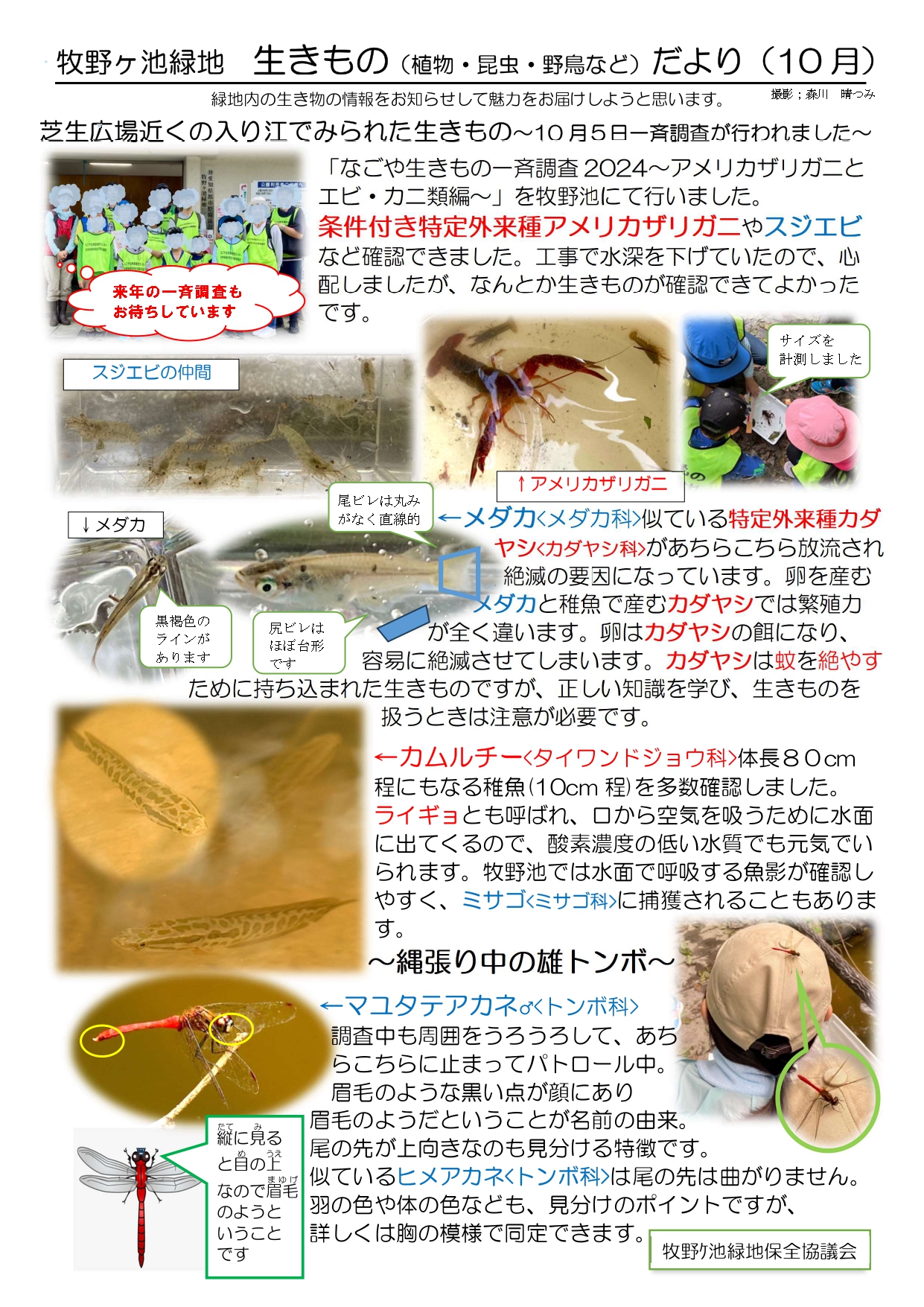 【お知らせ】牧野ケ池緑地 生きものだより(令和6年10月) 更新日 2024/12/01 牧野ケ池緑地 生きものだより(令和6年10月)が届きました。 こちらは、牧野ケ池緑地保全協議会の方々により作成されています。 牧野ケ池緑地の自然の魅力を再発見してみましょう。