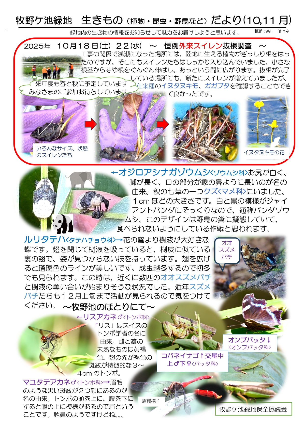 牧野ケ池緑地 生きものだより(令和7年10、11月)が届きました。
