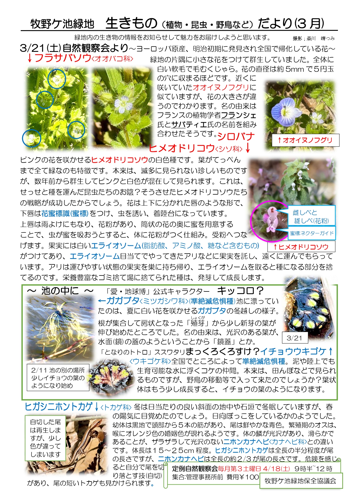 【お知らせ】牧野ケ池緑地 生きものだより(令和8年3月) 更新日 2026/04/04 牧野ケ池緑地 生きものだより(令和8年3月)が届きました。 こちらは、牧野ケ池緑地保全協議会の方々により作成されています。