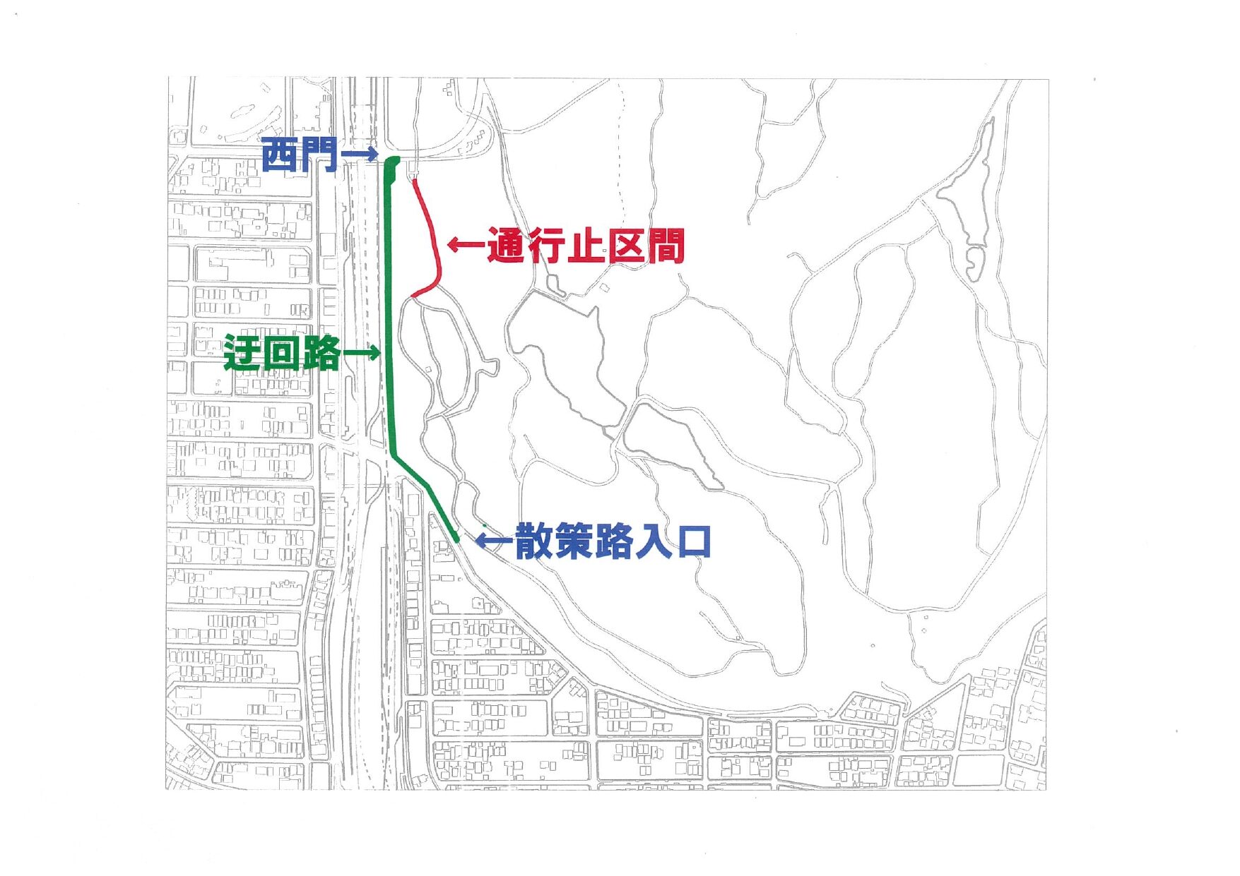 竹の小径、南児童園等のご利用の際は、緑地外の一般道路歩道への迂回が必要となります。下記の迂回路の案内を参照してください。