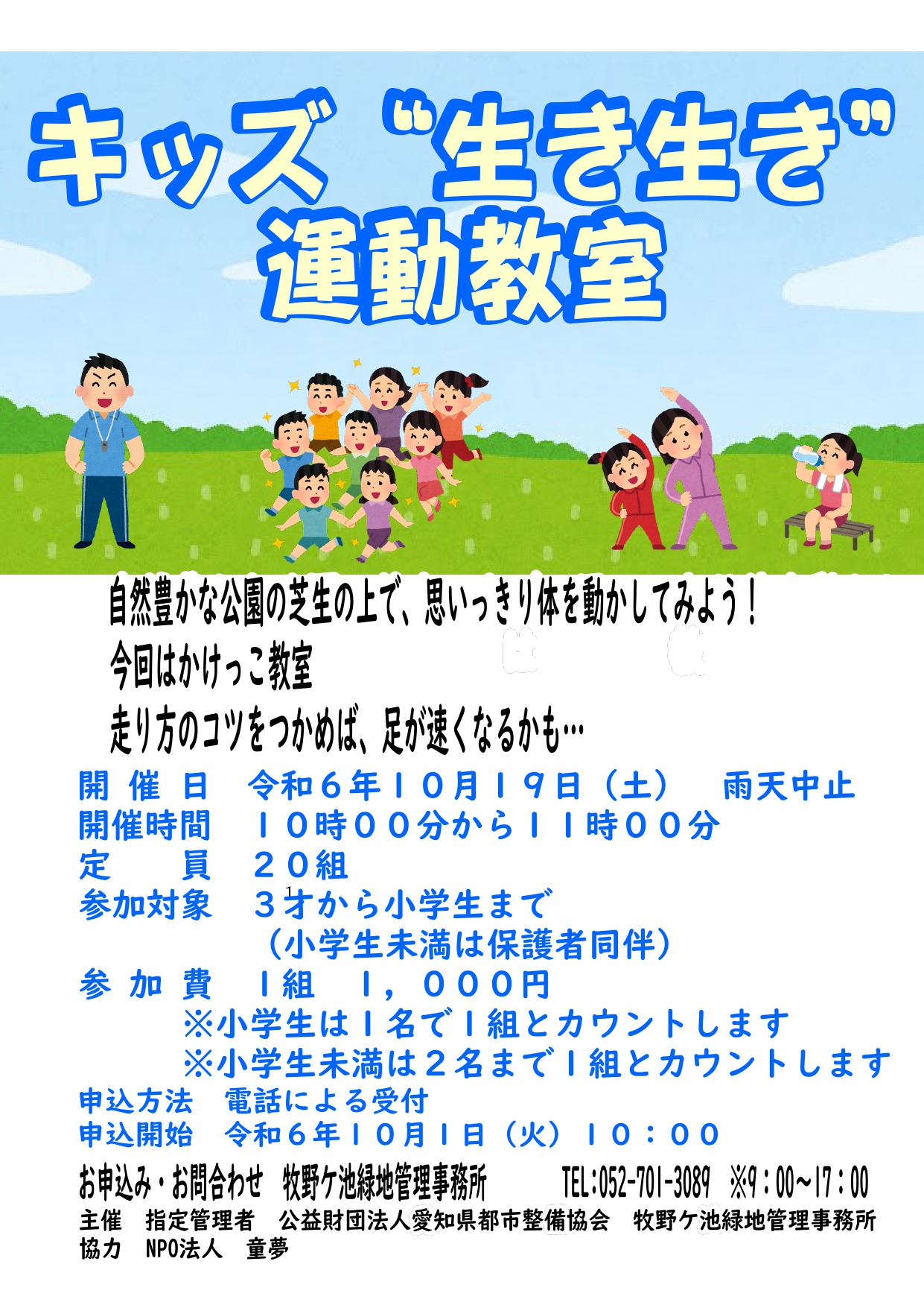 [お知らせ] 10/19 開催 キッズ‘’生き生き‘’運動教室 (受付開始10/1) 更新日 2024/10/23 令和6年10月19日(土) キッズ‘’生き生き‘’運動教室を開催します。 秋の運動会シーズンを前にちょっとした走り方のコツをつかめば足が速くなるかも? ご参加お待ちしています。