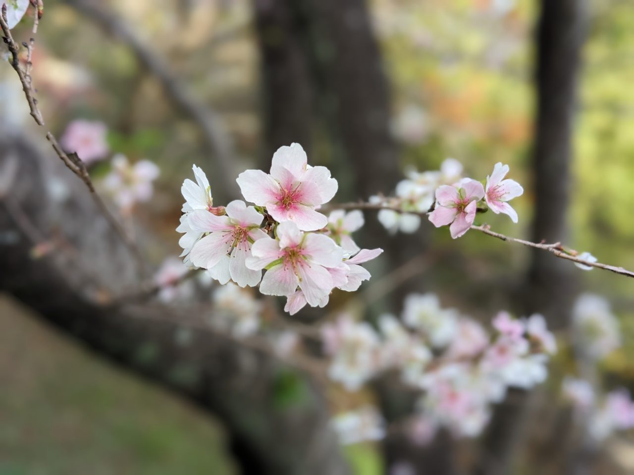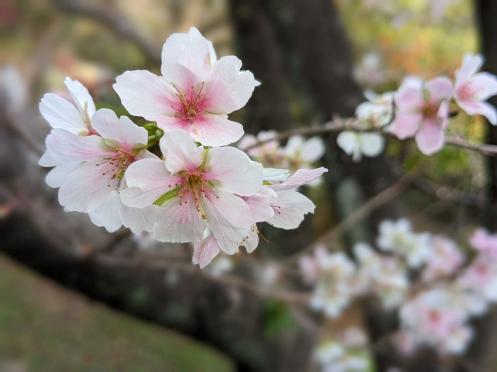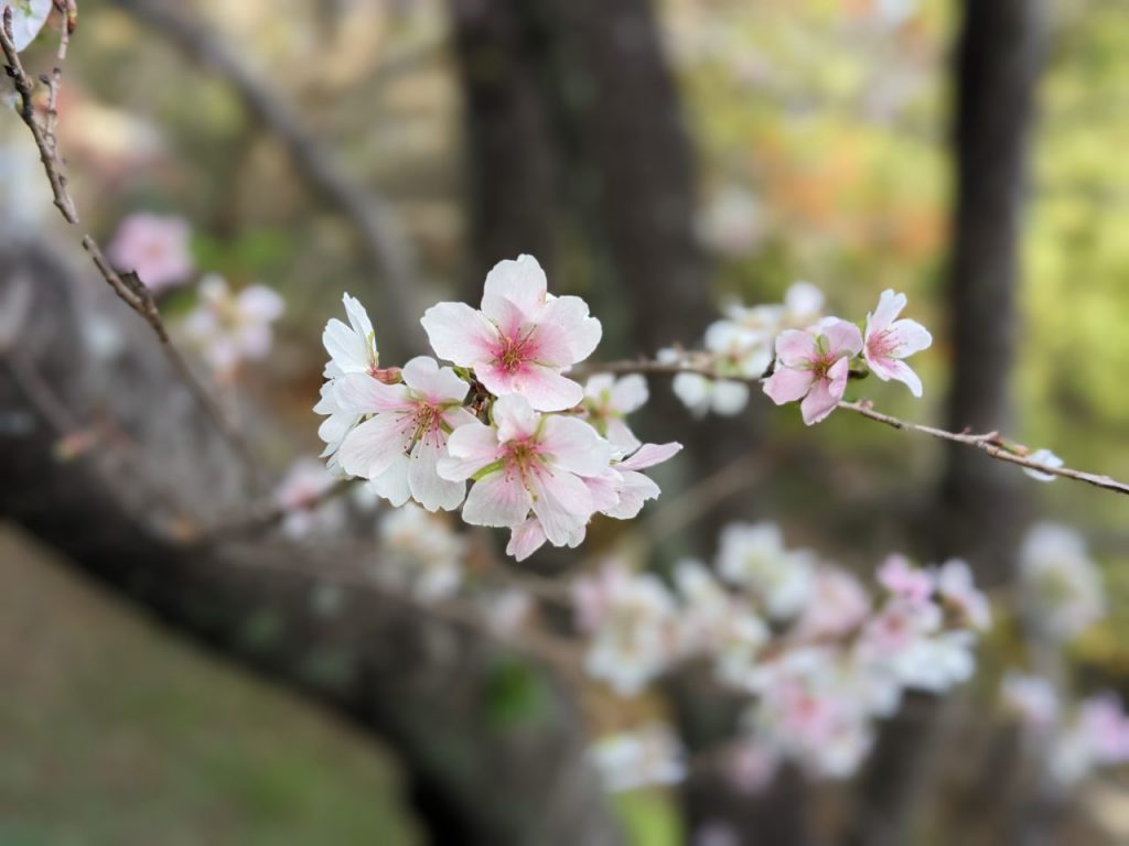 けんもり通信 11月10日号 更新日 2023/11/10 宝橋を渡ってすぐ、子どもの森の入口で 淡いピンク色の花の四季桜が出迎えてくれます。 四季桜は春と秋、年2回花を咲かせます。 ポツポツと12月ごろまで花を見ることができます。