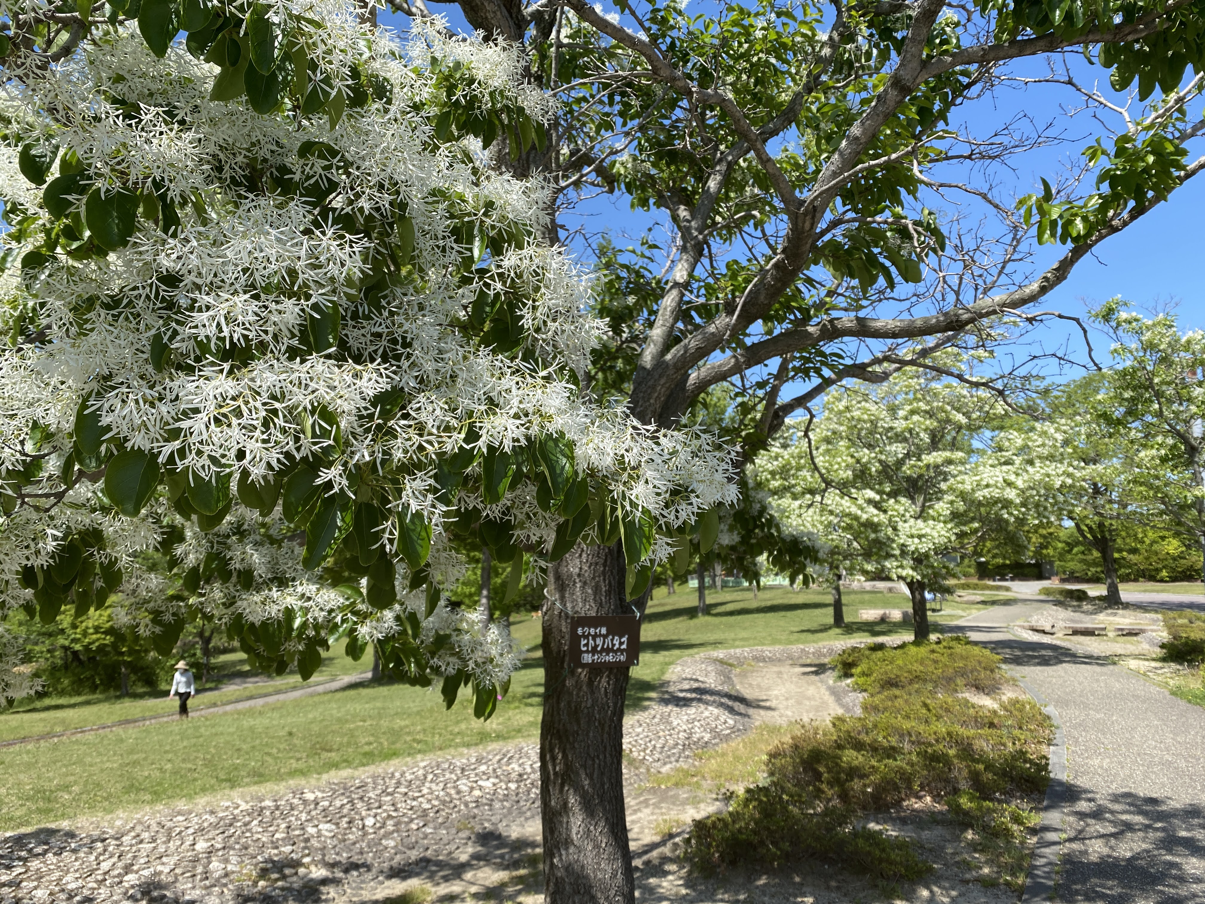 あいち健康の森公園にはニレなど、なんじゃもんじゃの樹といわれる樹木が複数ありますが、その代表として有名なヒトツバタゴの花が今満開です!真っ白で小さな星がたくさんくっついているようにも見えてかわいらしいですよ^^