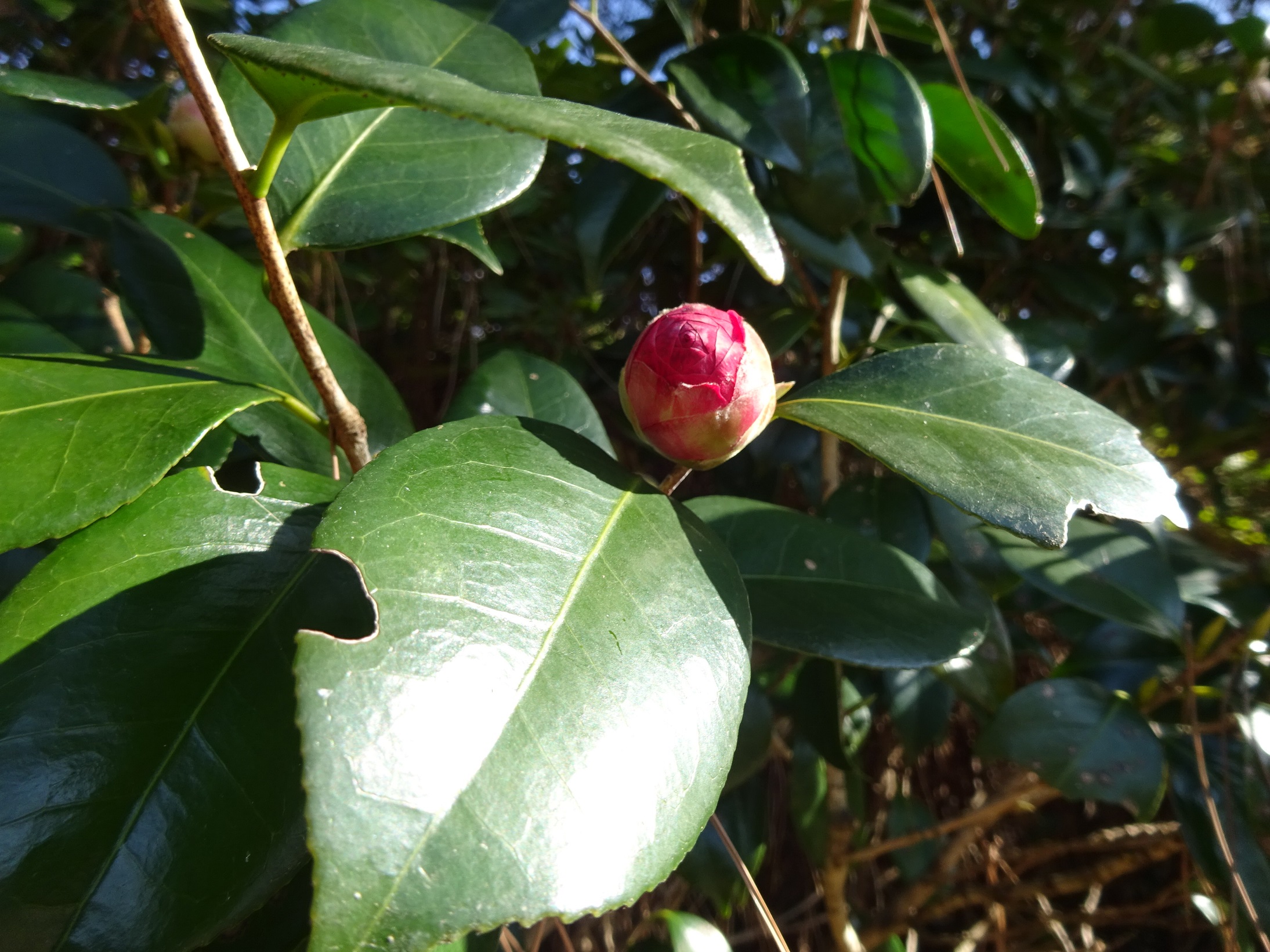 こどものひろば園路沿いで「オトメツバキ」が咲いています。
