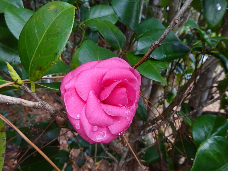 本日は朝から冬の冷たい雨。冬の寒空の下、まだ蕾が多い中一輪花を咲かせているのを発見。