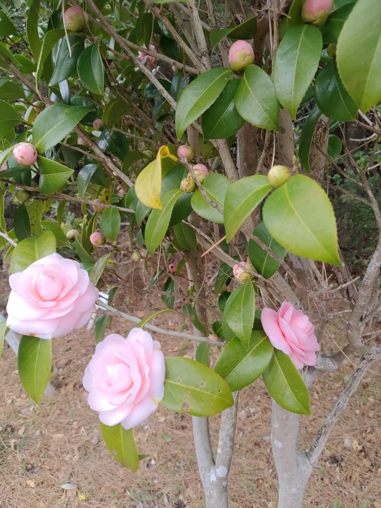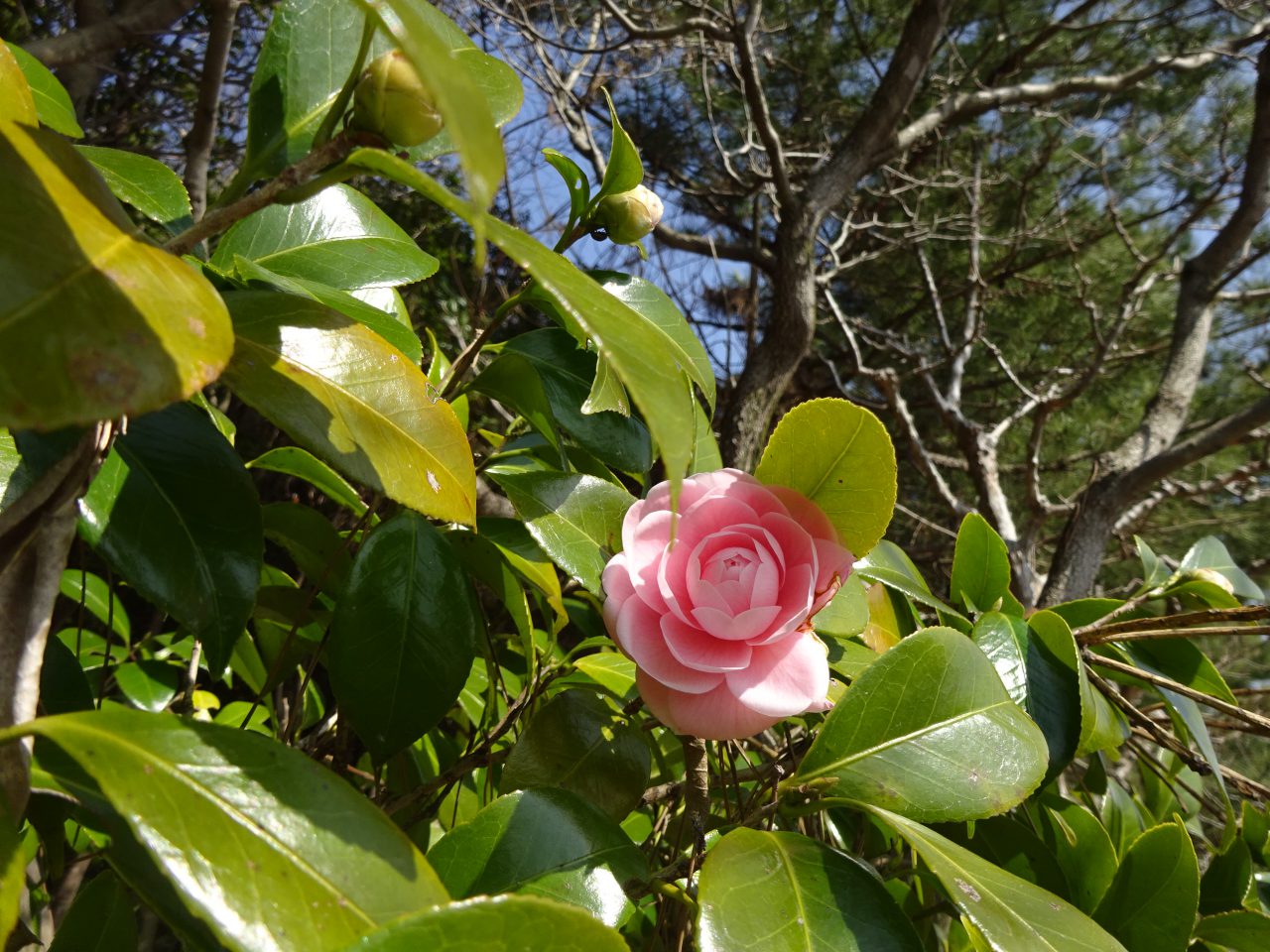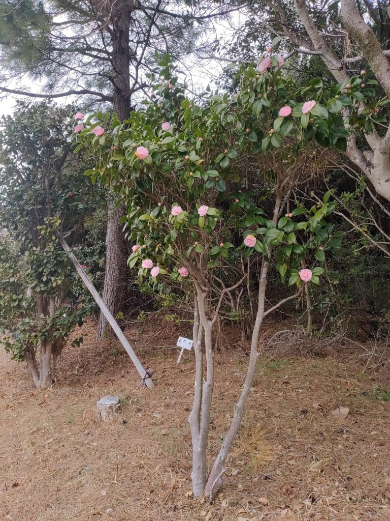 こどものひろば園路沿いで薄ピンク色のオトメツバキが蕾もありますが見頃です♪