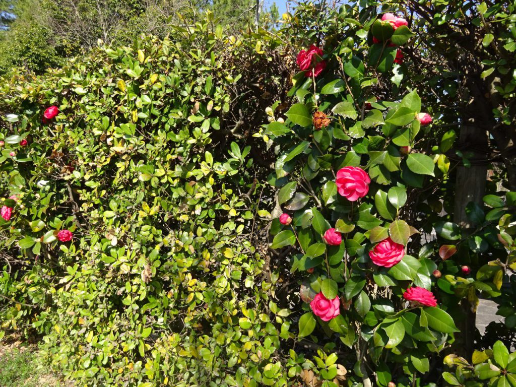 こどものひろば園路沿いの「オトメツバキ」が今年も可愛らしい花を咲かせていました。