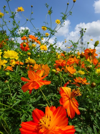 秋の空に黄色・オレンジのお花が映えますね。