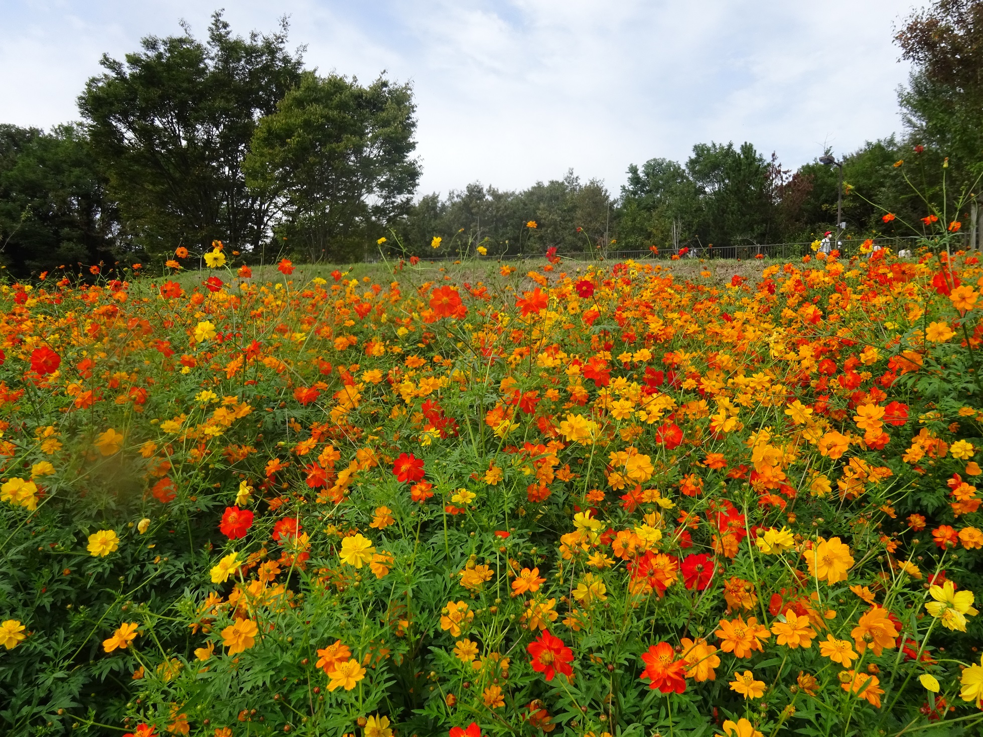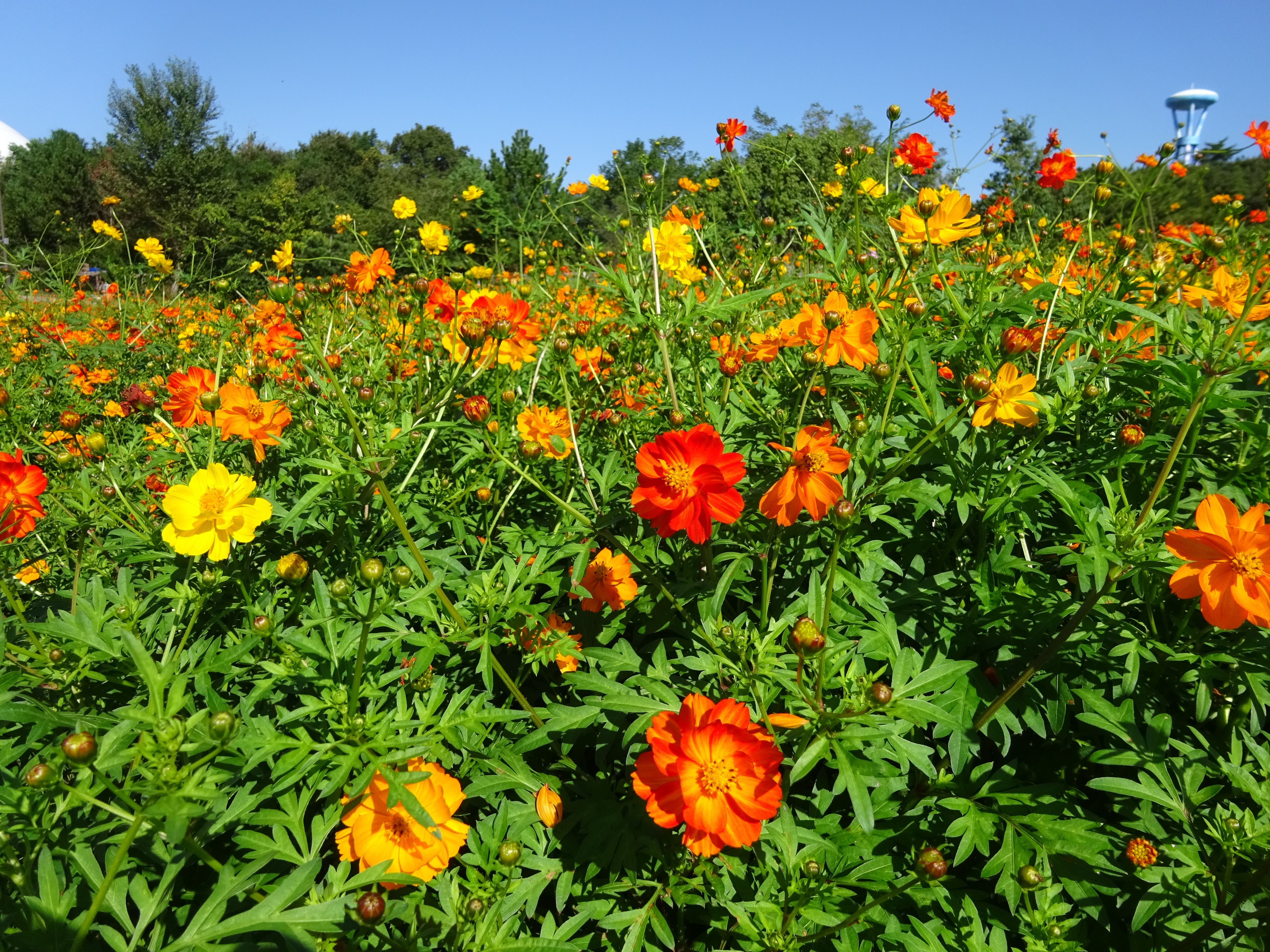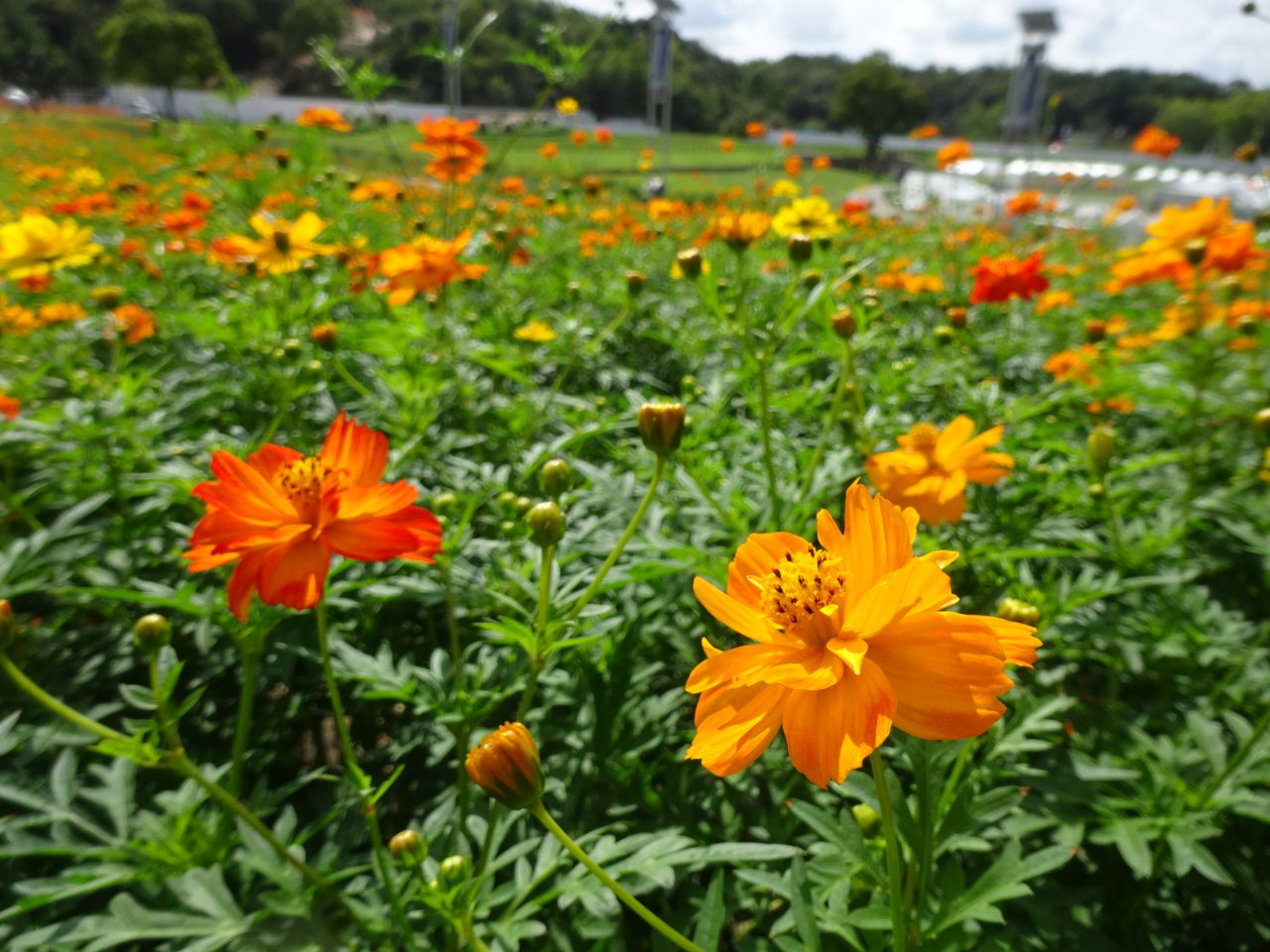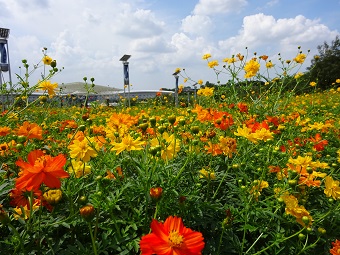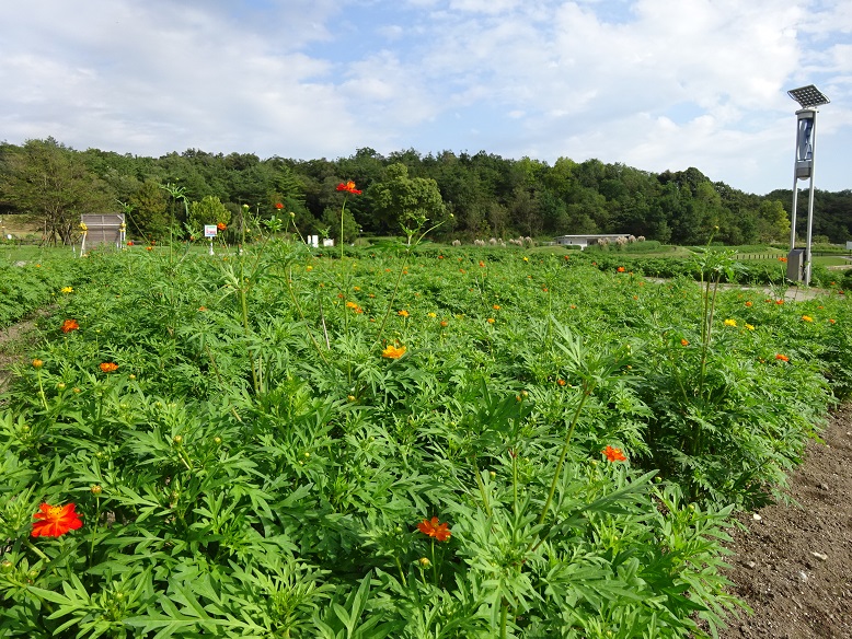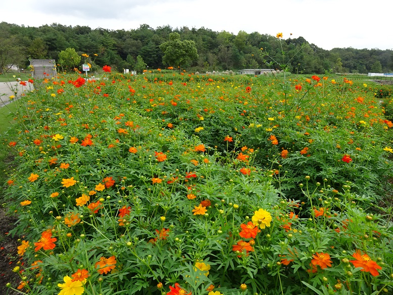 大芝生広場のお花畑で、今年も「キバナコスモス」が咲き始めました。