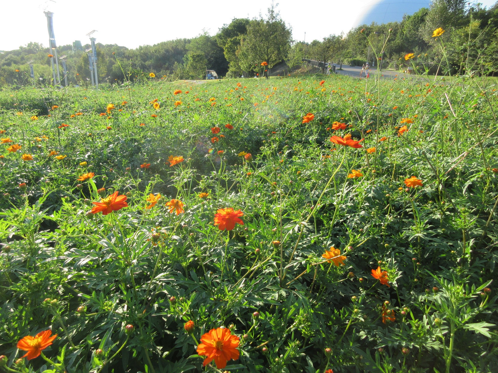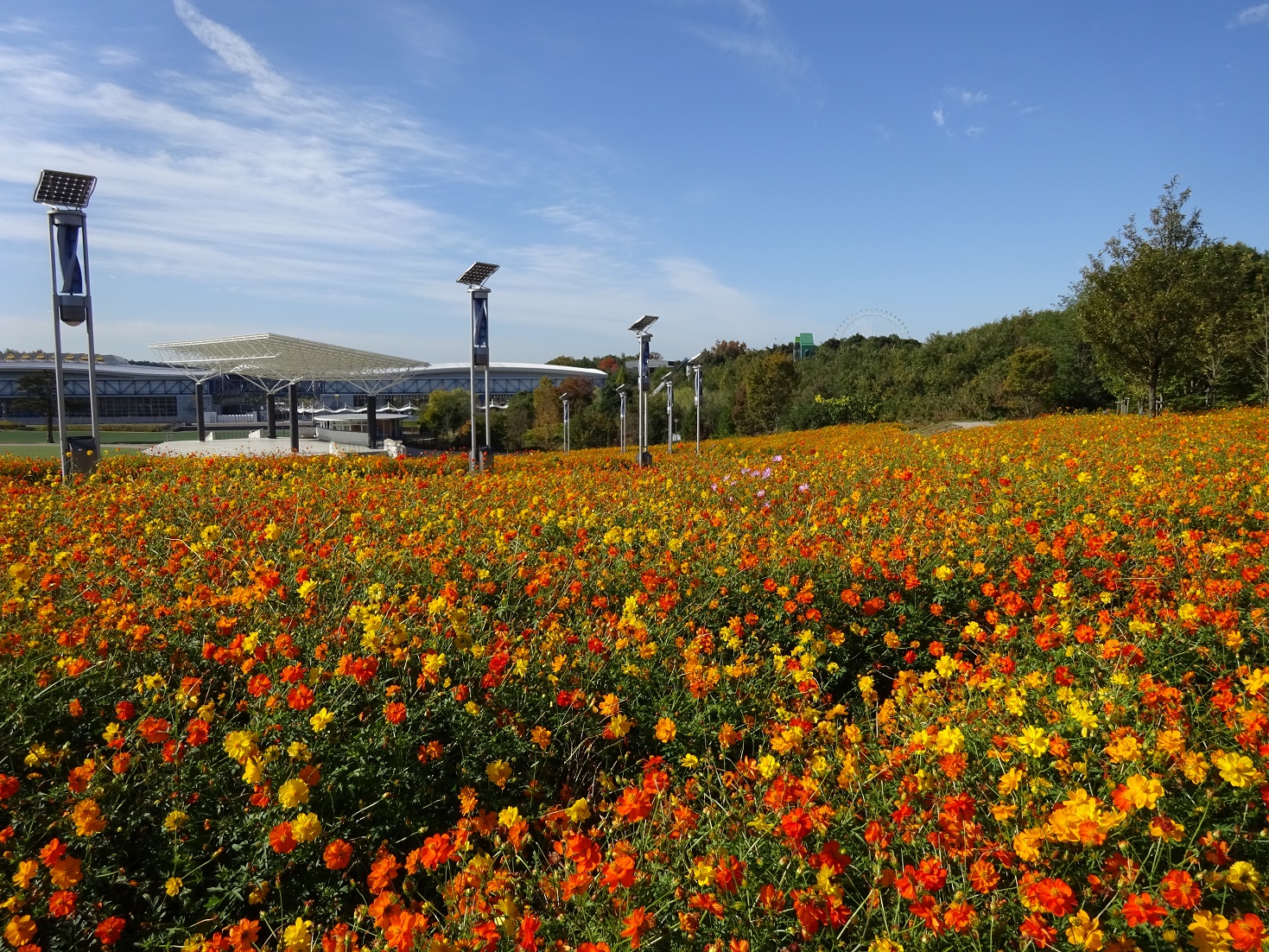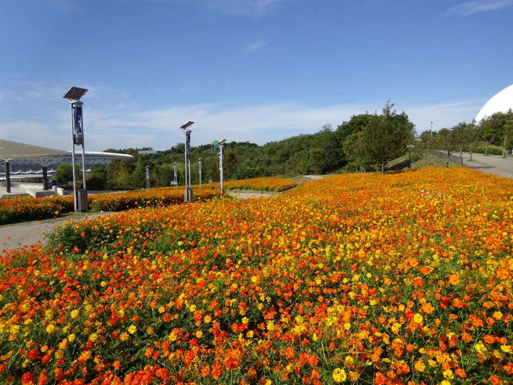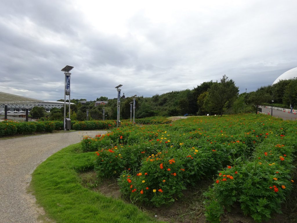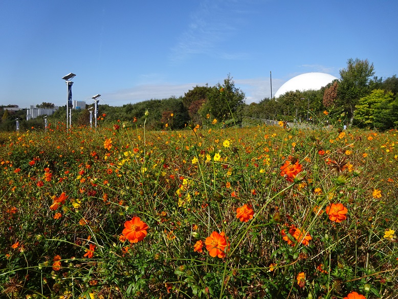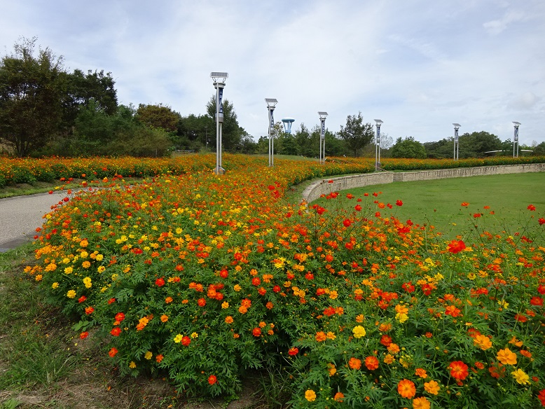 地球市民交流センターからあいちサトラボへ続く園路、大芝生側にキバナコスモスがたくさん咲くエリアがあります。