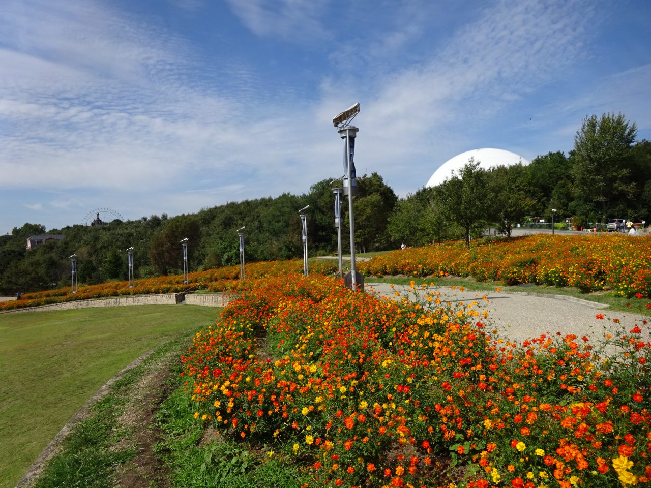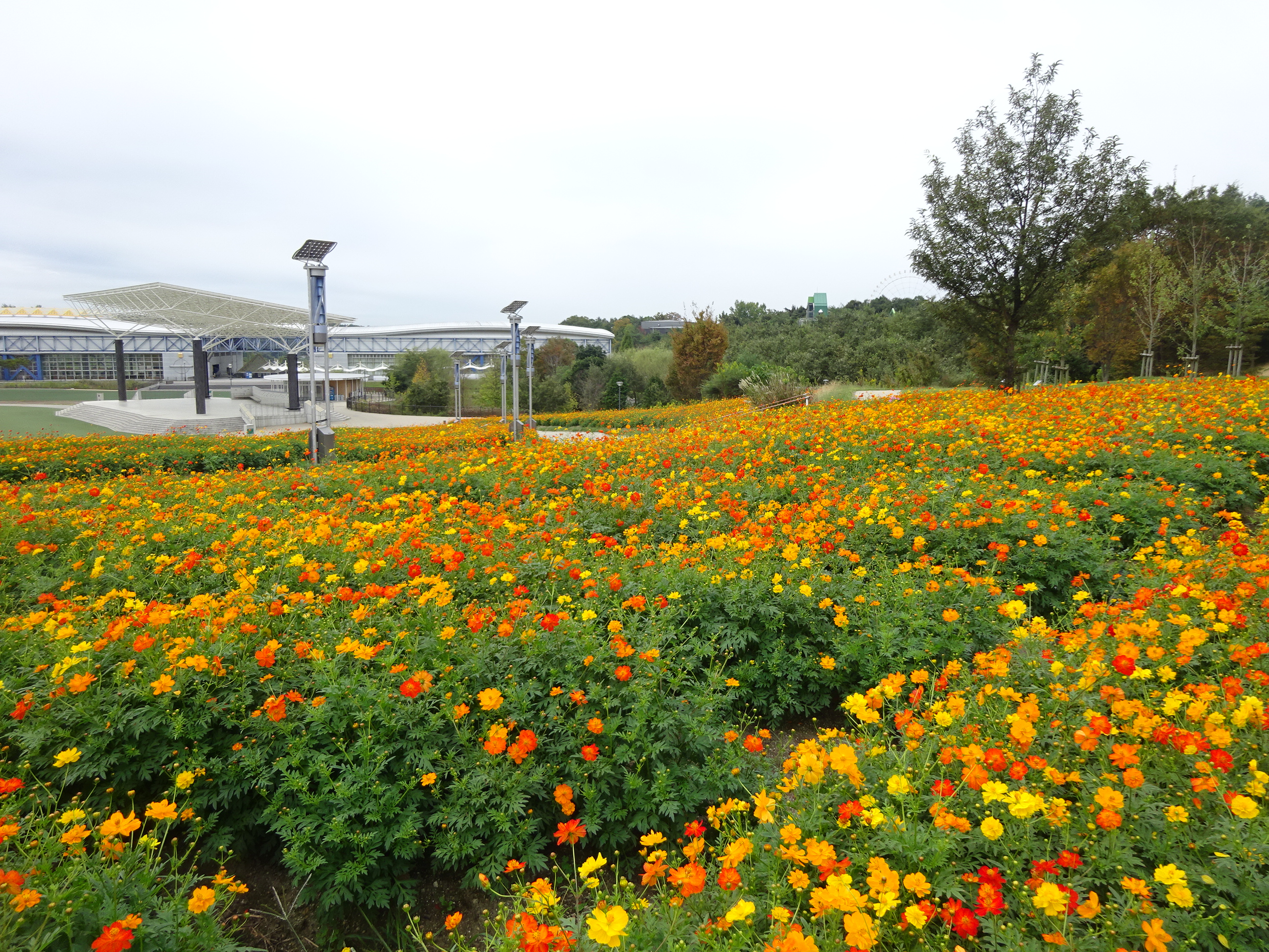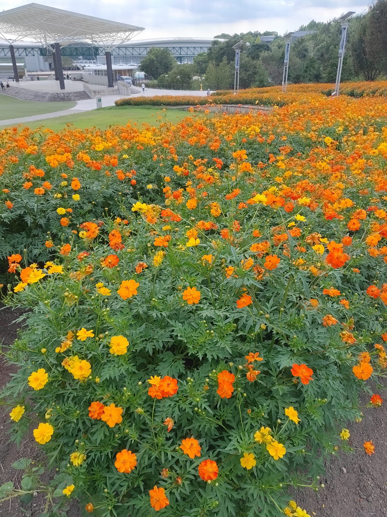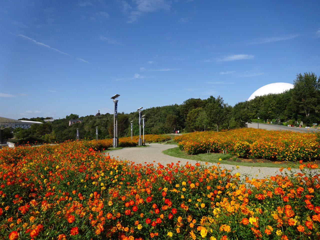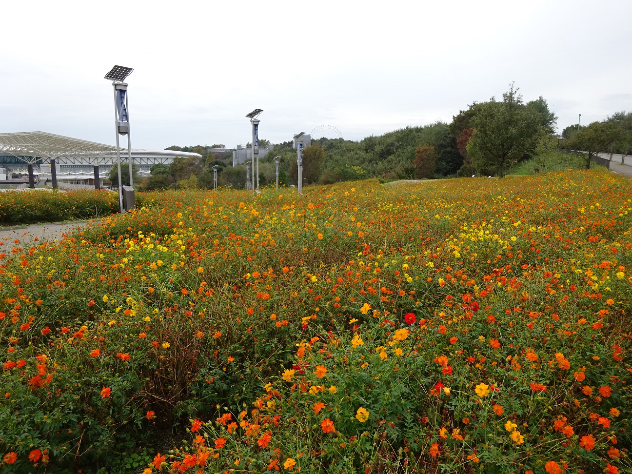 地球市民交流センターからあいちサトラボへ続く園路、大芝生側にキバナコスモスがたくさん咲くエリアがあります。
