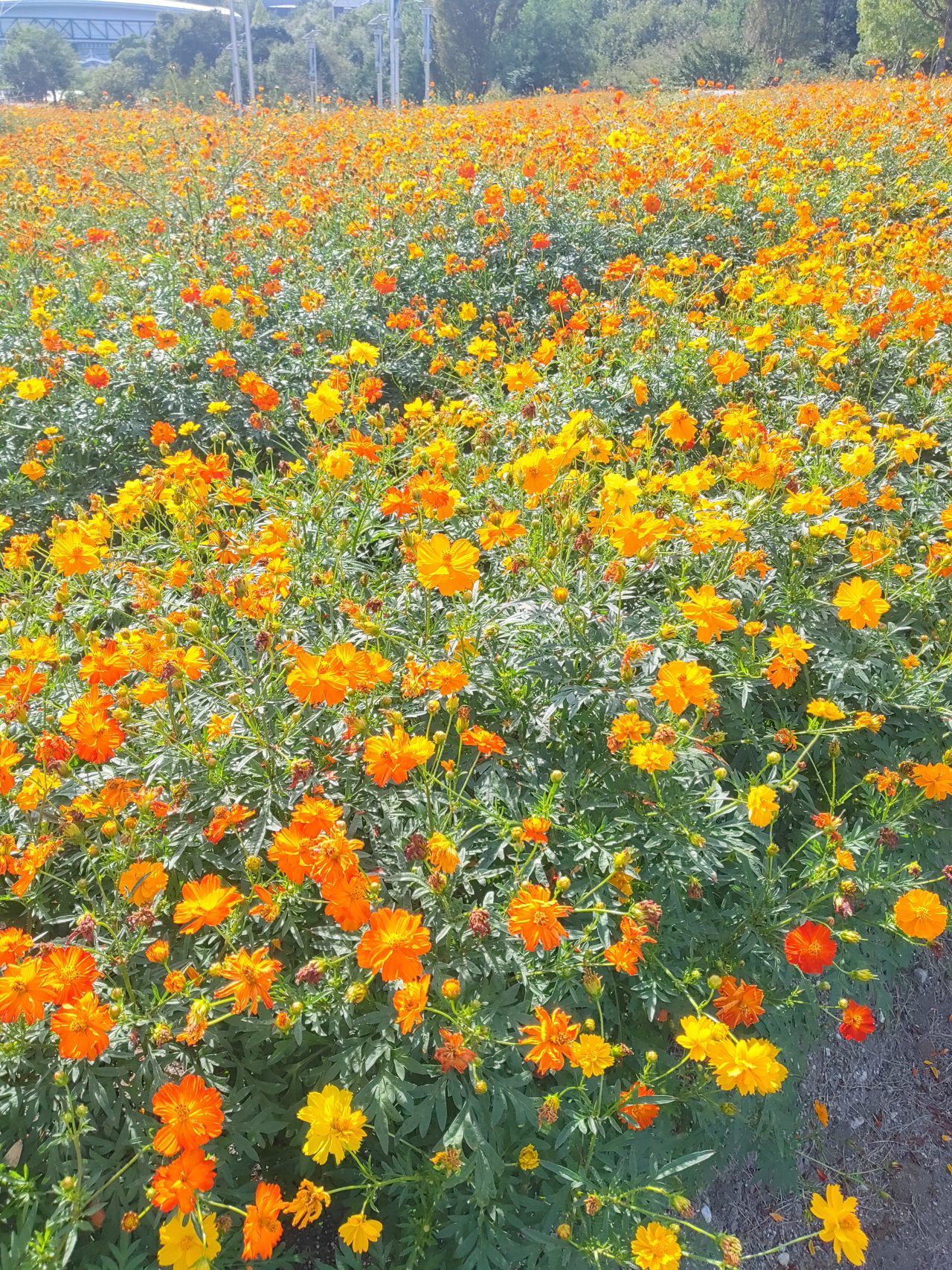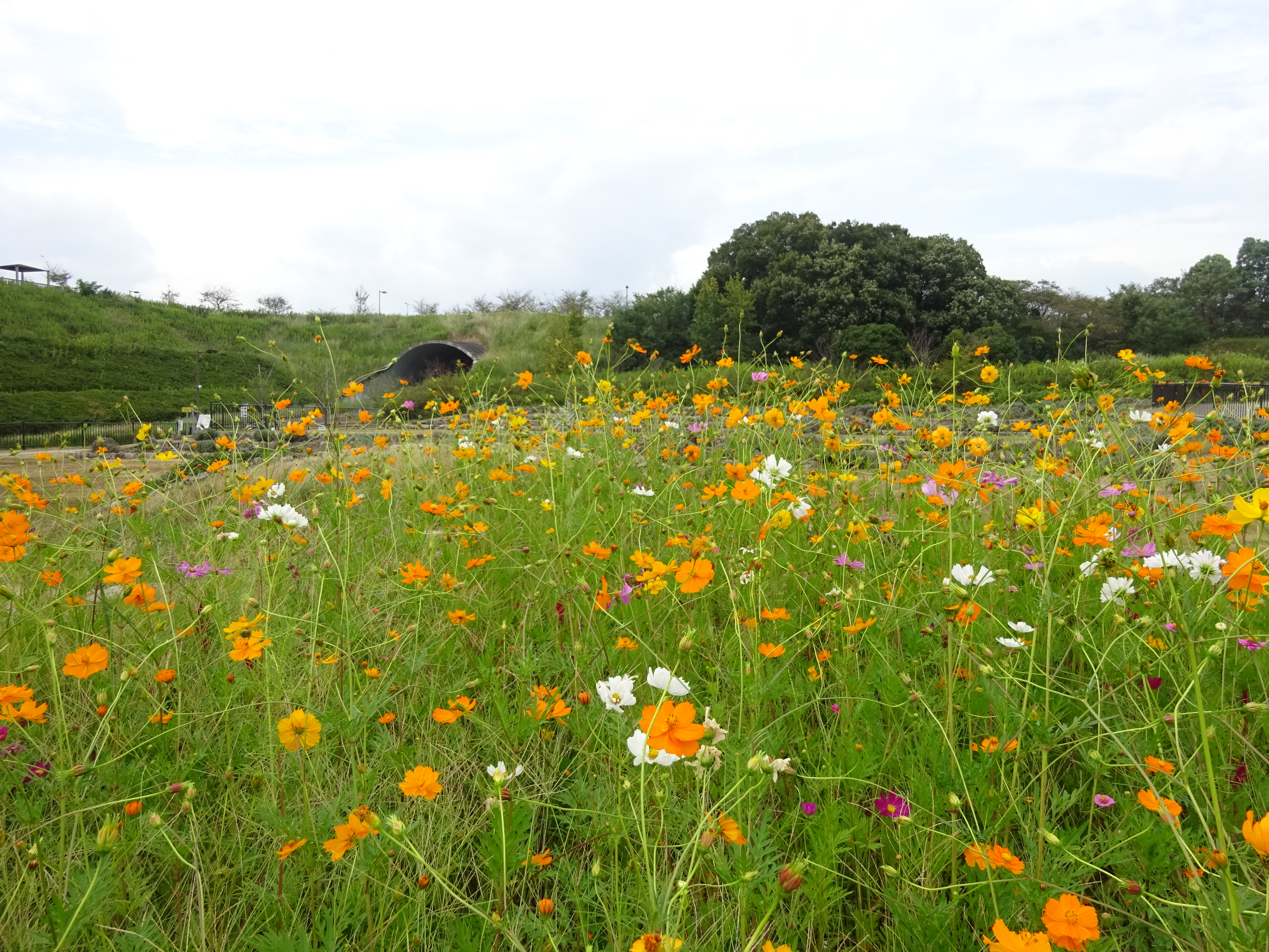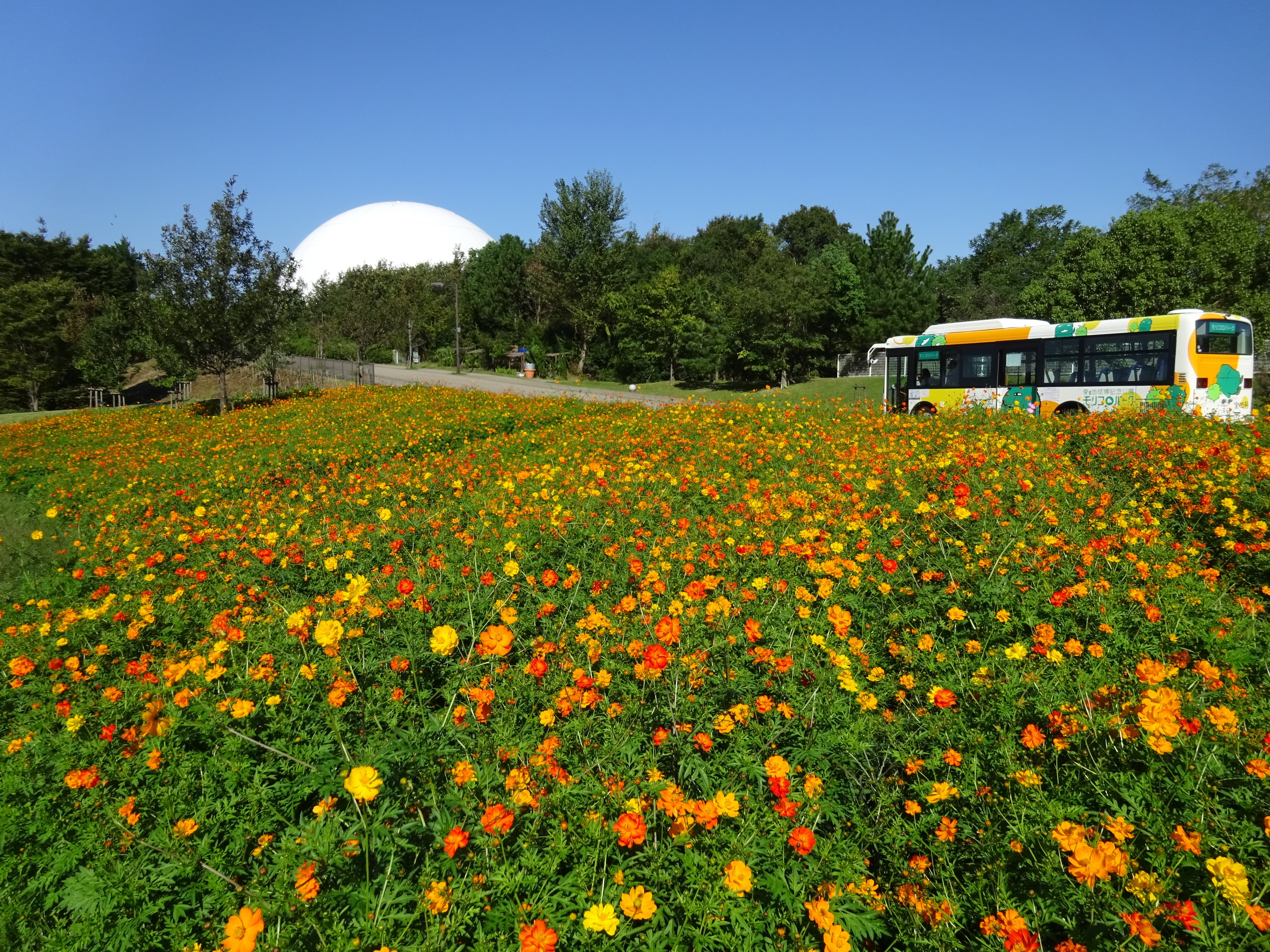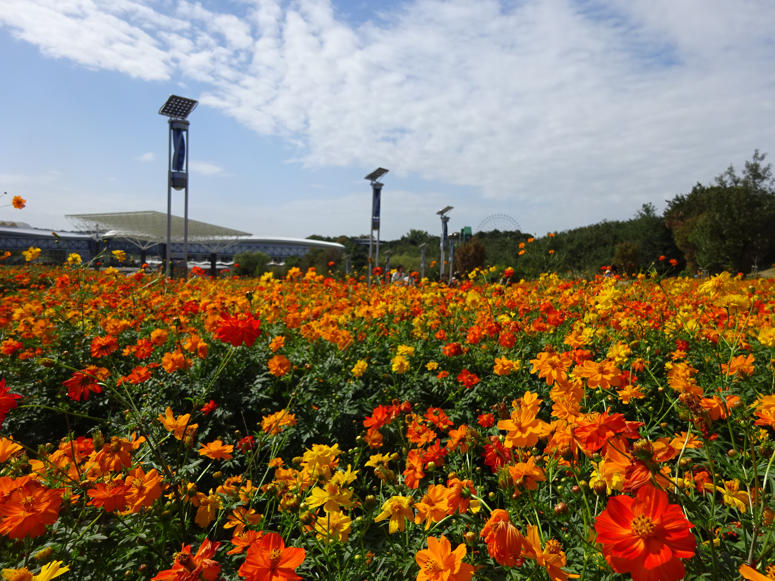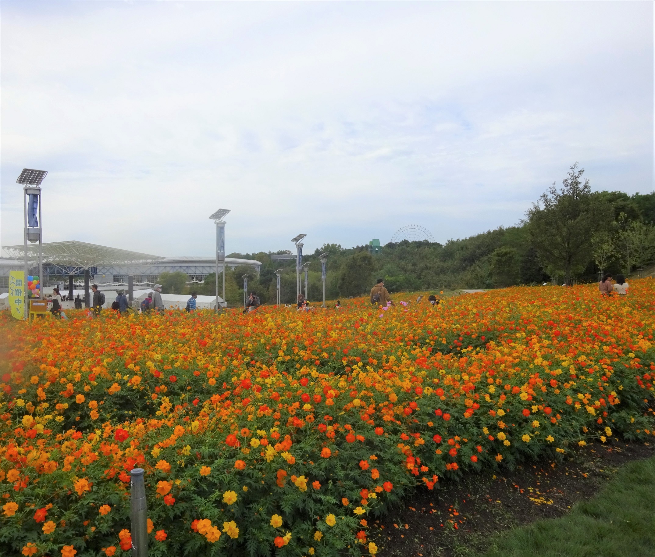 地球市民交流センターからあいちサトラボへ続く園路、大芝生側にキバナコスモスがたくさん咲くエリアがあります。