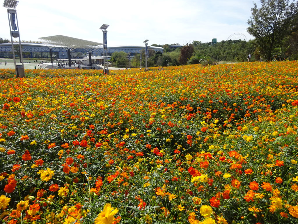 大芝生広場の花畑では「キバナコスモス」が見頃を迎えています。