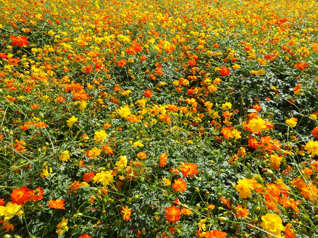 キバナコスモスが、ほぼ満開になりました。あたり一面オレンジに染まっています。