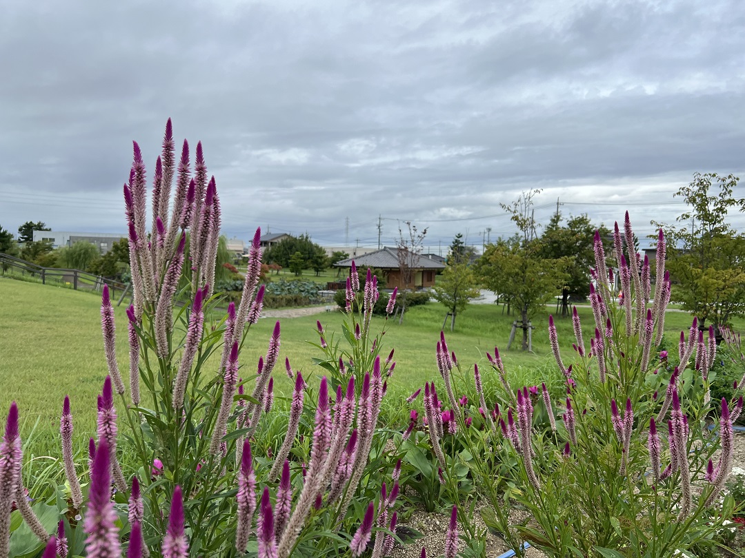 水生花園の護岸花壇でケイトウの花が咲いています。