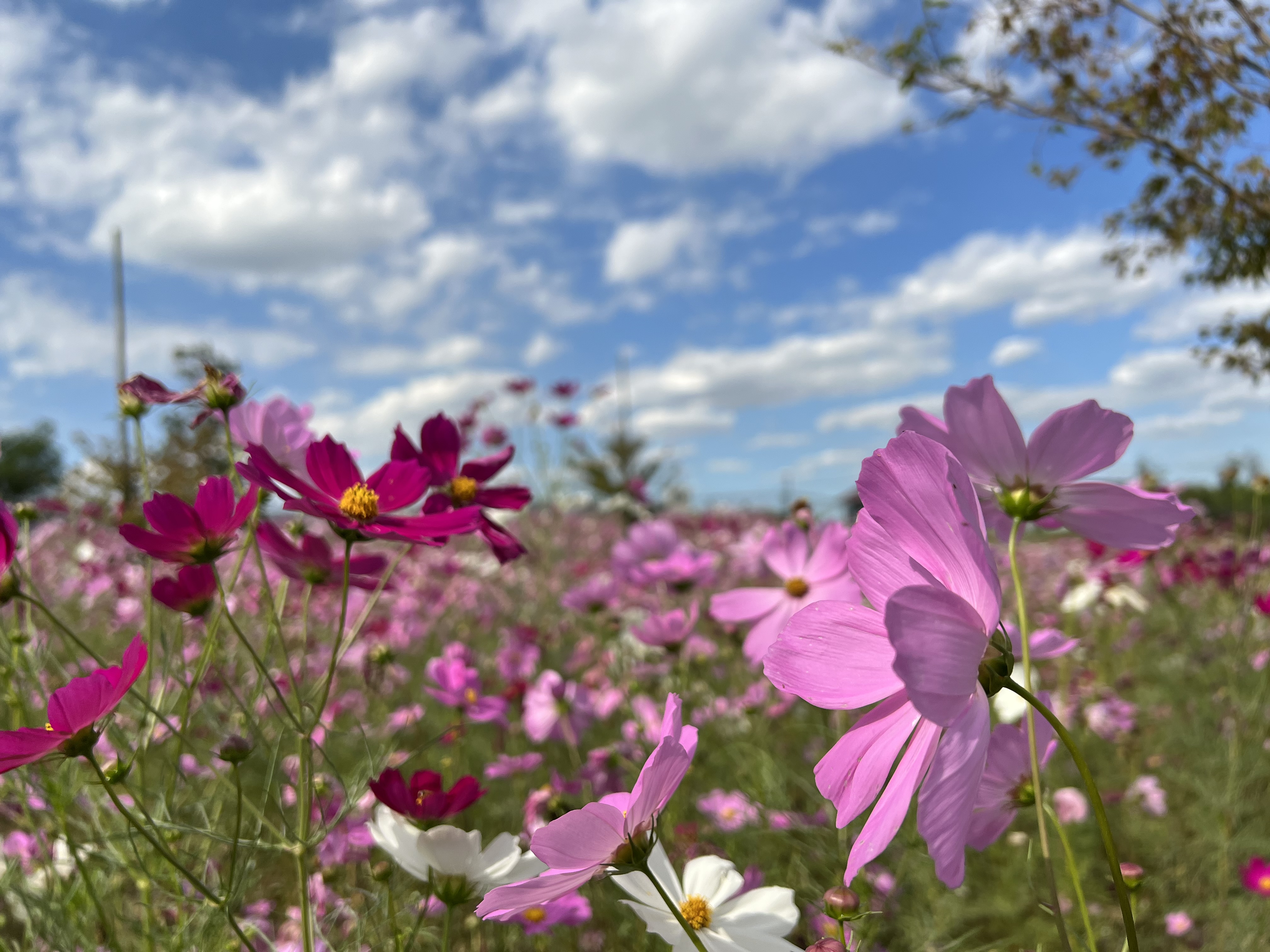 自然ふれあい生態園 コスモス花畑 安城市東端町 2021.10.10の様子】たくさんのお客様にご覧いただき、コスモスもとても喜んでいるようです。