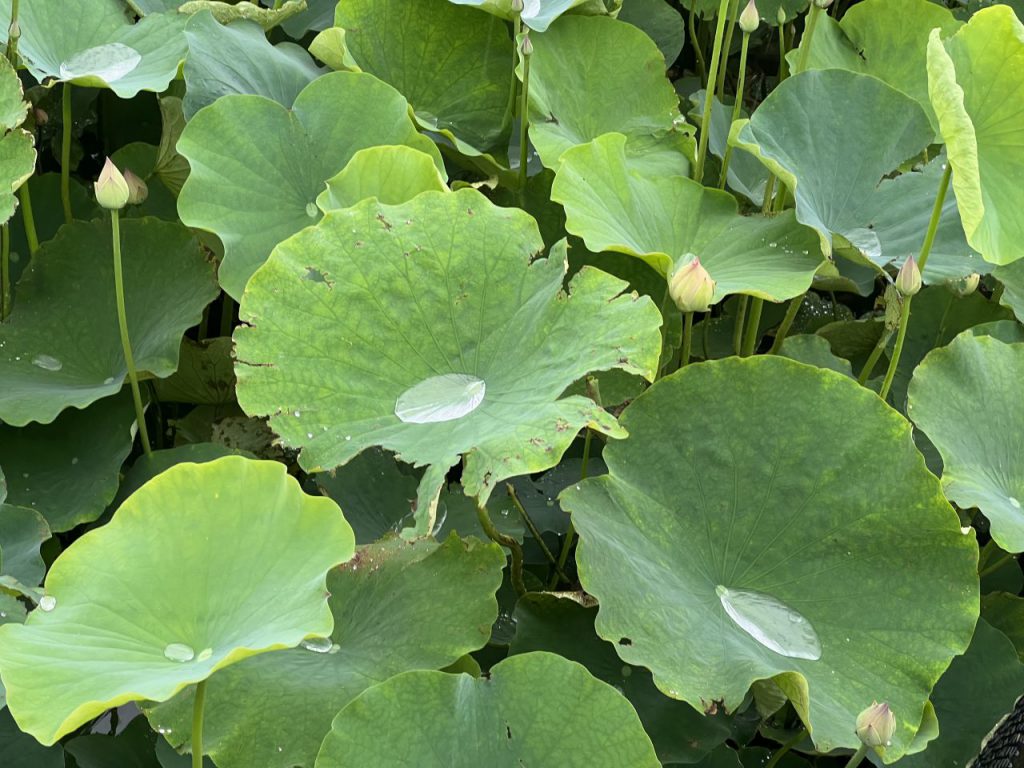 ハスのつぼみも膨らんできました。葉っぱの上に雨水がたまっています。