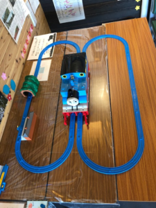 プラレールって線路つなげればいいのですが、これがなかなか手強い…。立体的にイメージ通りに作るって難しいですね。『おもちゃの病院』から列車が戻ってくるまでになんとかしなくては…。