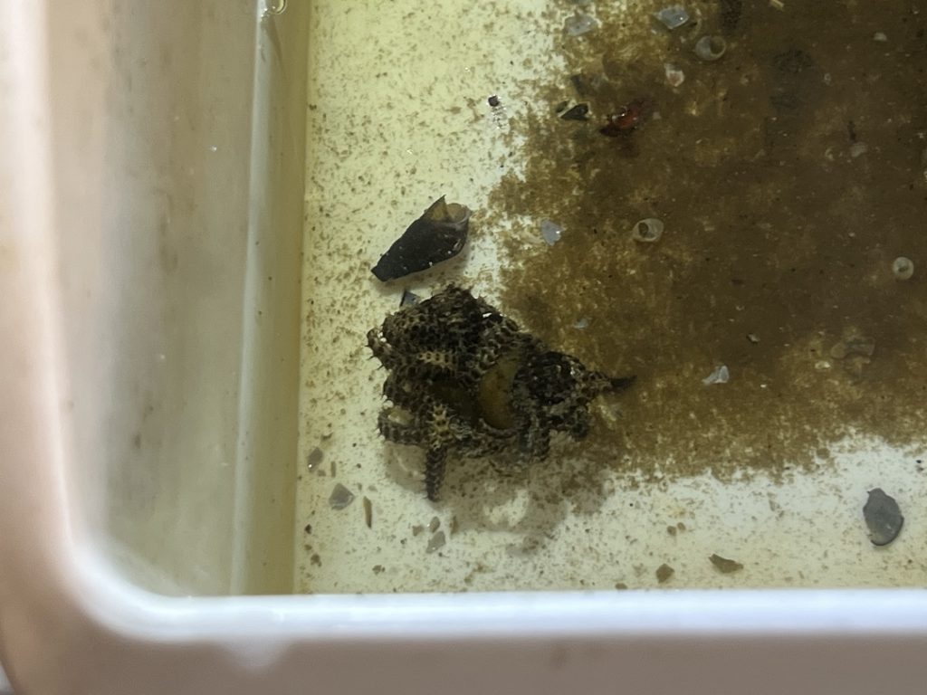 ホタルの幼虫が餌のカワニナを食べている様子です。