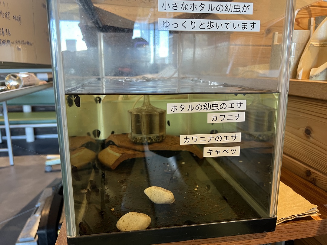 桃の園休憩所でホタルの幼虫を飼育しています。来年には成虫になって飛んでくれるとおもいます。
