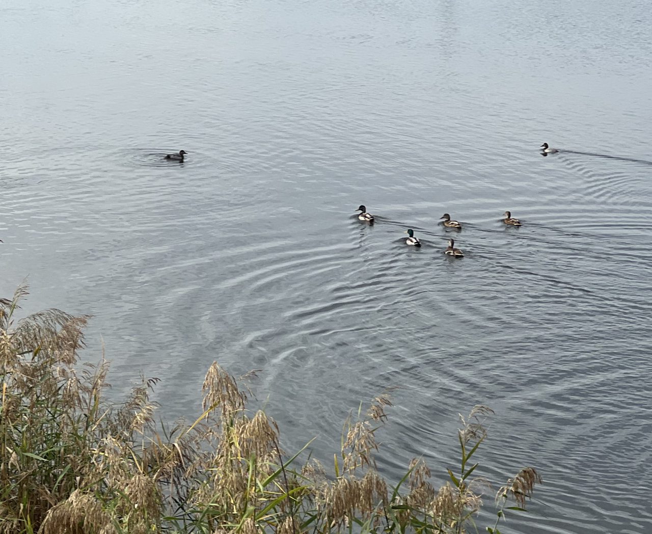 油ヶ淵の水面をマガモの親子が仲良く泳いでいます。