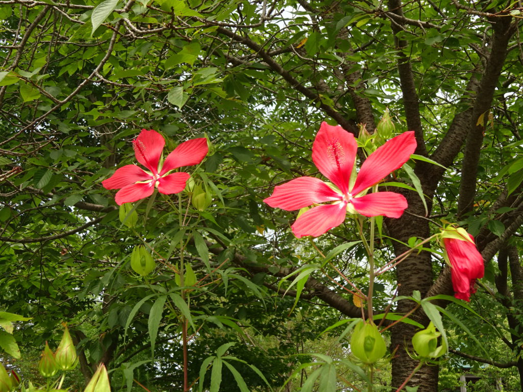 大花壇で「モミジアオイ」が咲いていました。
