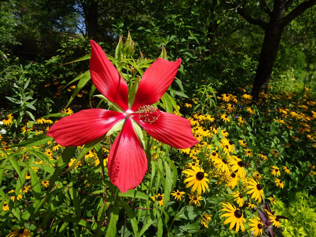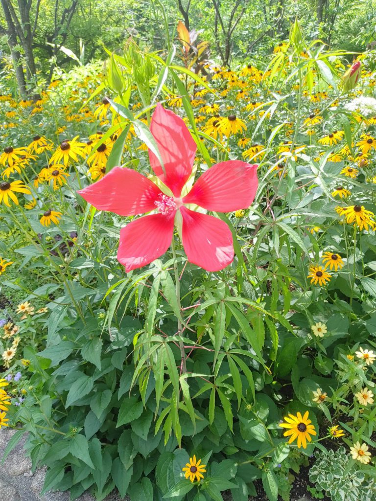 大花壇で「モミジアオイ」が咲いているのを見つけました。