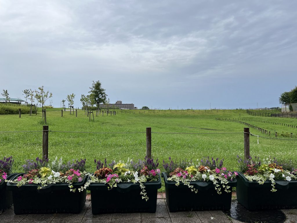 7月11日 雨が降っていますね。事務所前の椅子から眺めた桃の園の風景です。