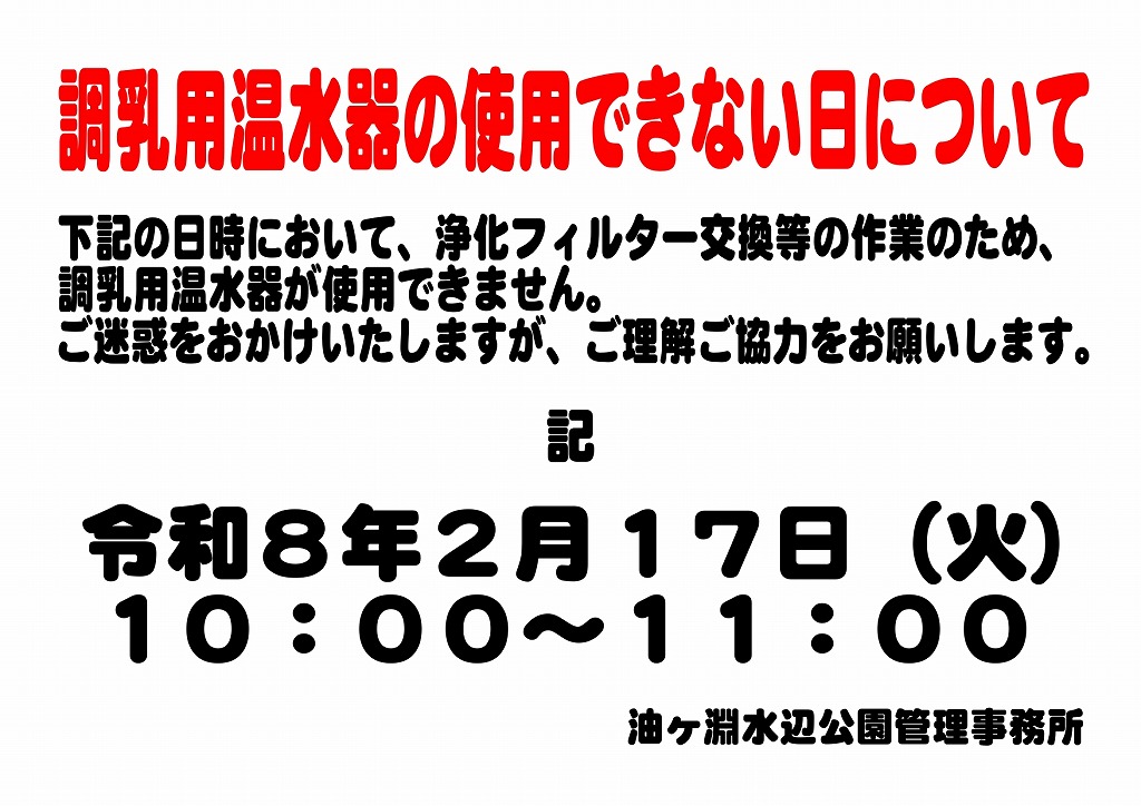 令和8年2月17日(火)10:00~11:00の間、調乳用温水器の浄化フィルター交換等のため、使用できません。