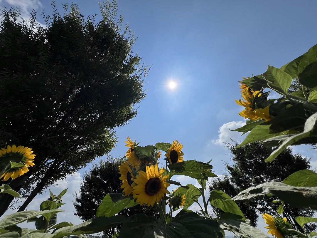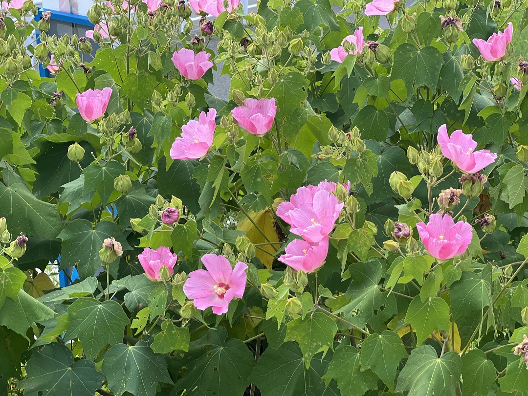 暑い日が続きますね。公園内で元気いっぱい咲いているヒマワリとフヨウの花です。
