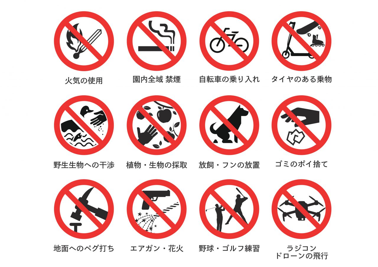 • 公園内でのローラースケート、キックボード、スケートボード、 ランニングバイク(ストライダー)、ラジコン、ドローン、エアガン等危険な遊具の使用を禁止します。