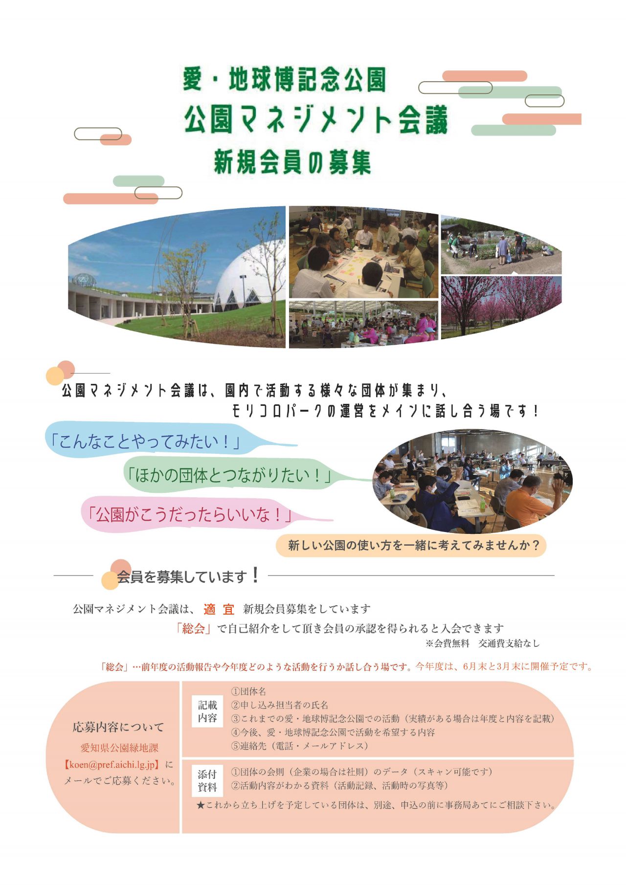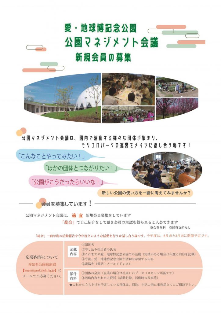 愛・地球博記念公園(モリコロパーク)には「公園マネジメント会議」と呼ばれる、公園という公共財産のマネジメントを行政だけに任せてしまうのではなく、志のある市民が集い、県民と行政のパートナーシップにより、公園利用者の満足度向上等を目的に「考え・話し合い・実践する」場があります。