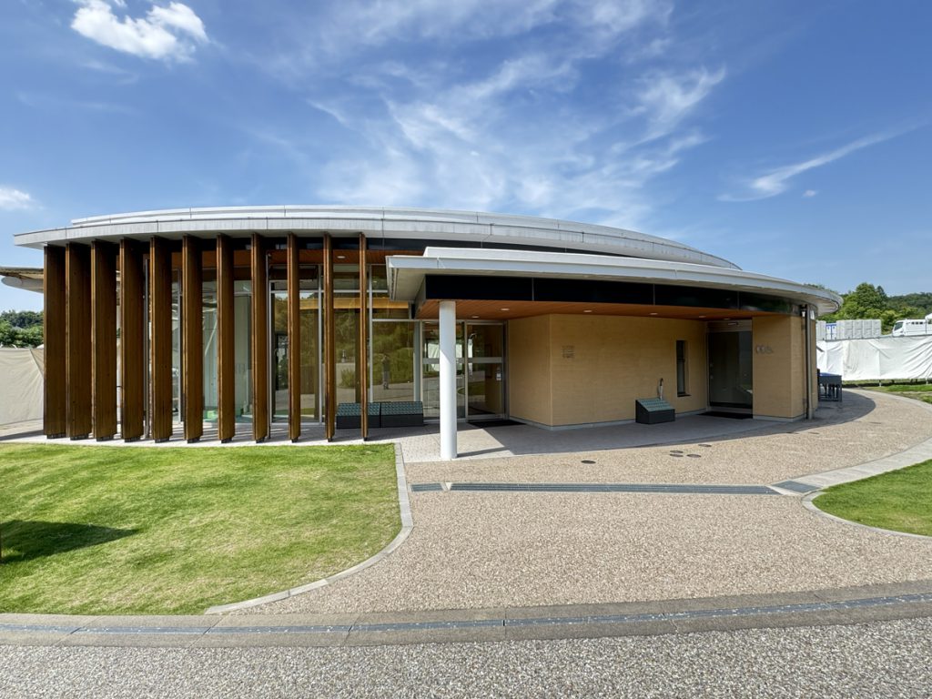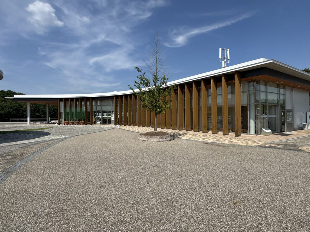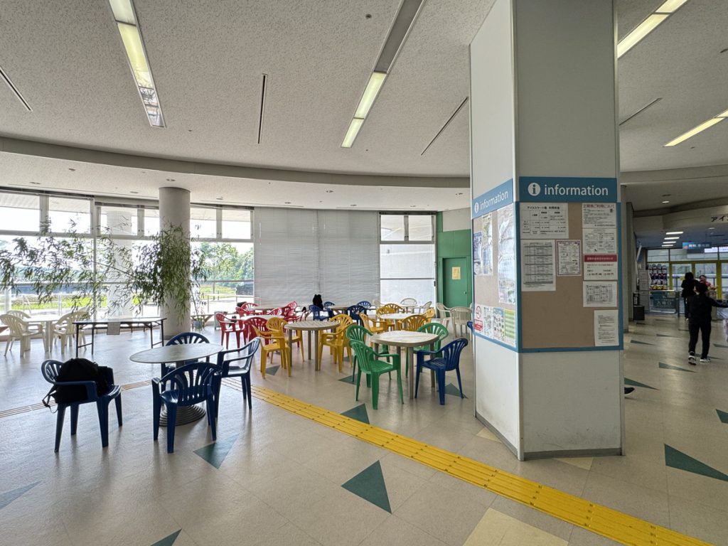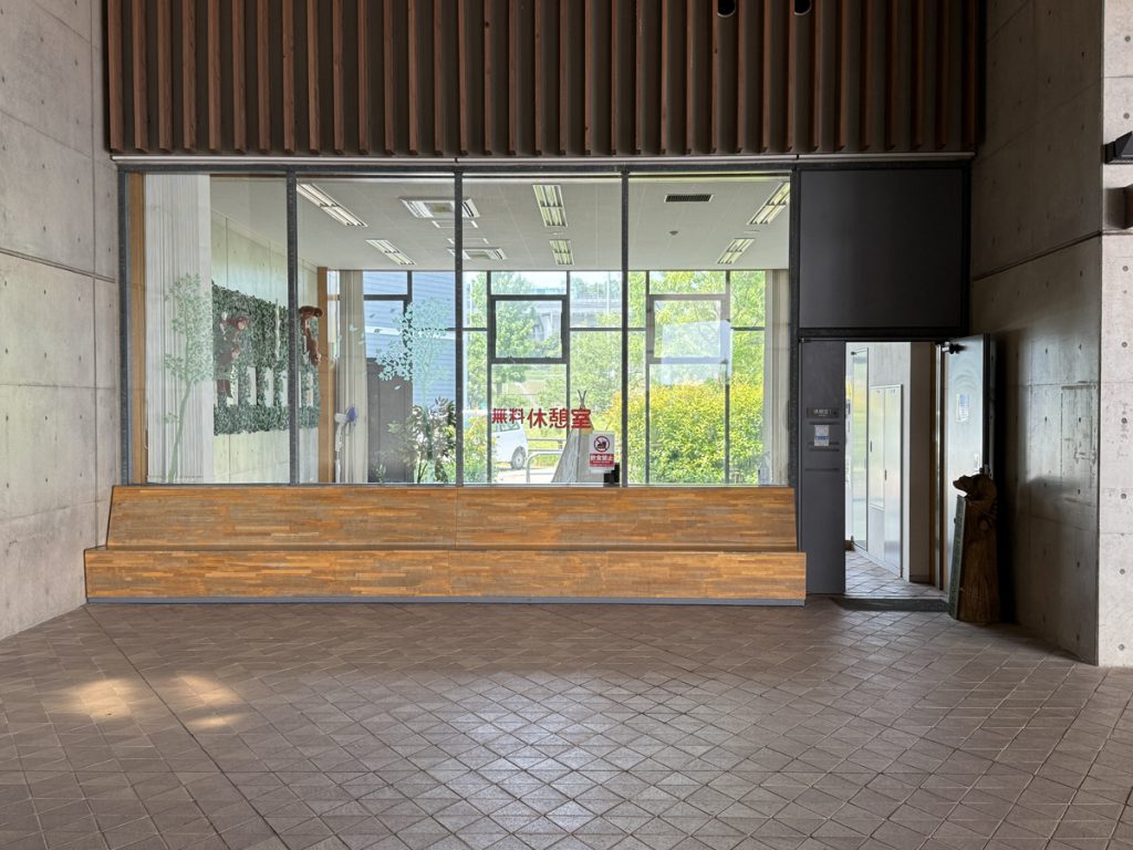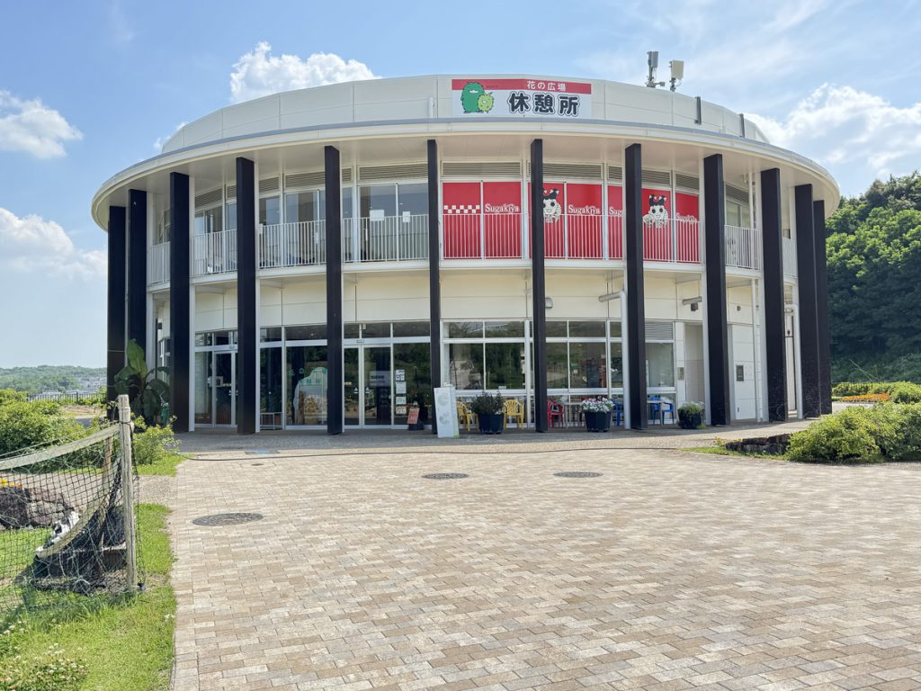 花の広場にある休憩所。一階は無料休憩スペースとなっており、2階にはスガキヤがあります。(ご利用時間:17:00まで)