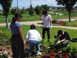 暑い日差しの中、学生の豊かな感性で花壇デザインを考え、それに基づき植付作業を行いました。