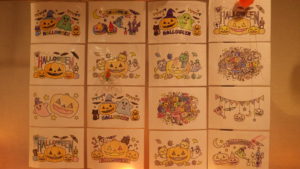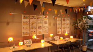 ハロウィンの飾りつけをしたコーナーで「ぬりえ」を楽しみましょう!