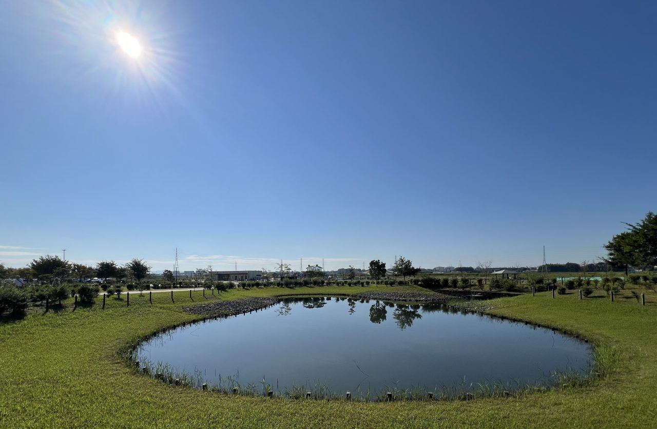 開園時の自然ふれあい生態園の風景です。風もなく木々が奇麗に池に映っていますね。