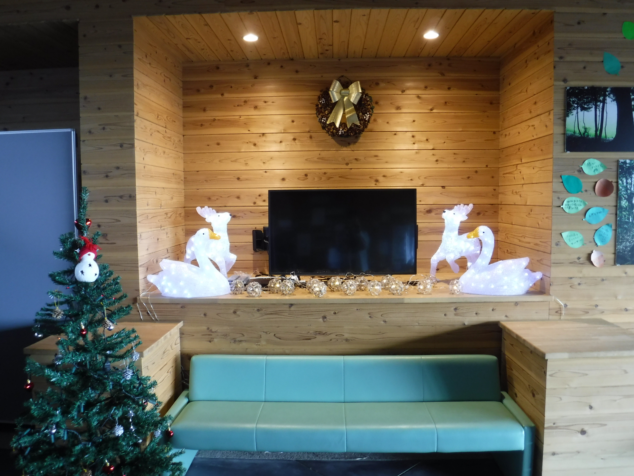当、公園で採取した松ぼっくりで作ったリースが飾ってありますよ。