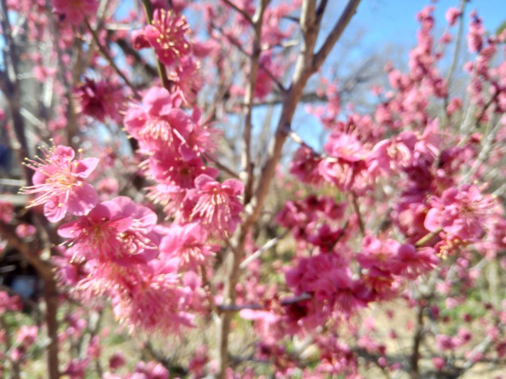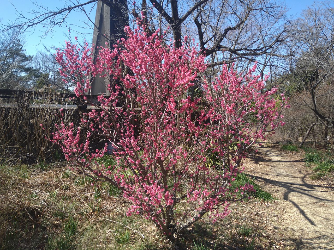園内各所で花が咲き始めました。 この写真は、本園忠霊塔の梅の花です。