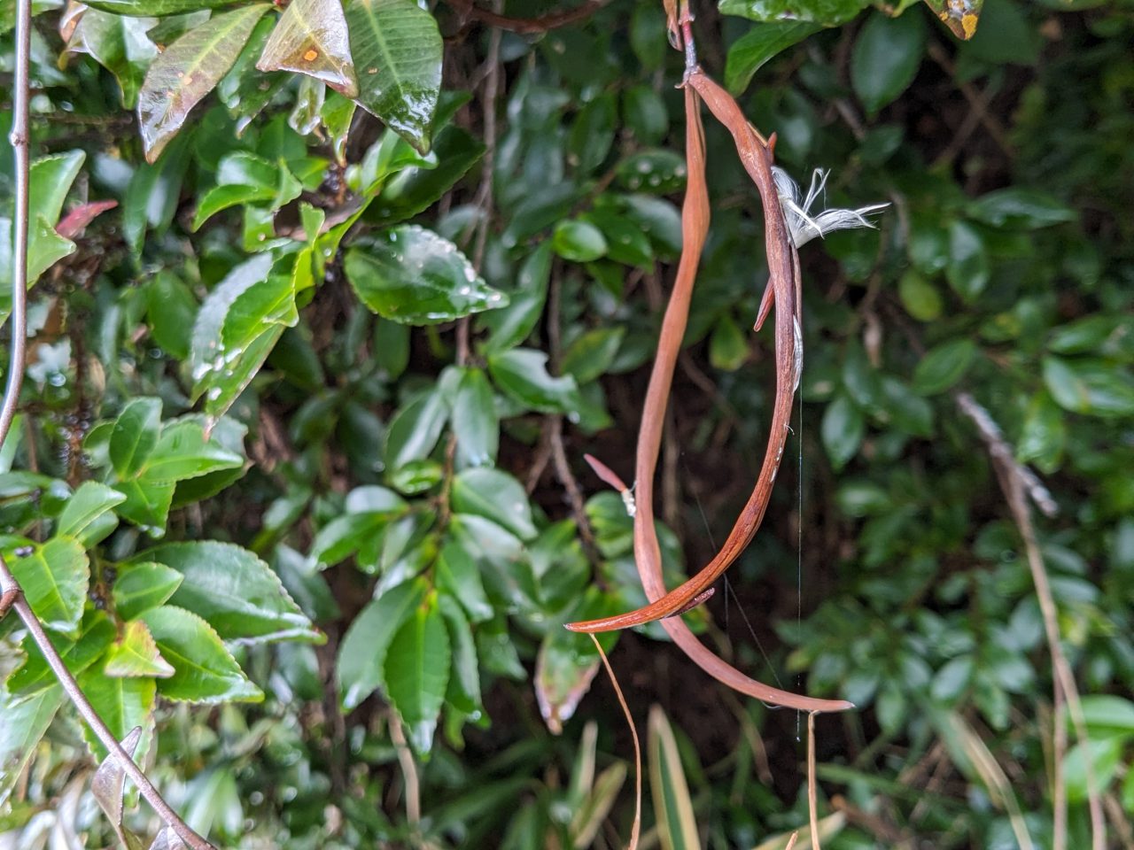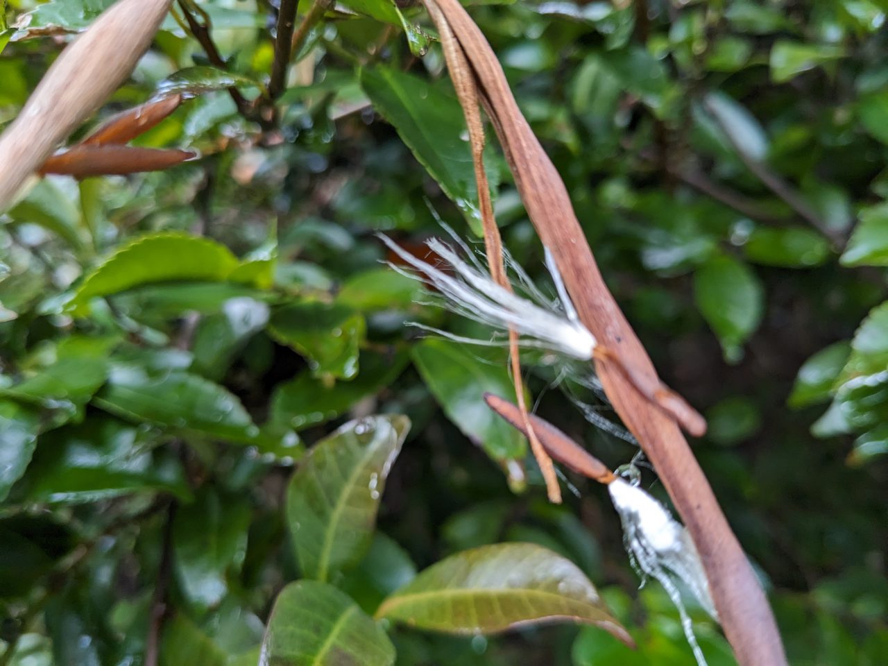 正体判明!! 更新日 2024/02/01 園内を歩いていると空から白い物体が ふわふわと漂っているのを見かけます。 落ちたフワフワの物体を手に取ってみると 綿毛のような種でした。何の種かと気になっていたら 本日判明しました、それは・・・・・ テイカカズラでした。 細いサヤの中に綿毛の種がぎっしり詰まってます。