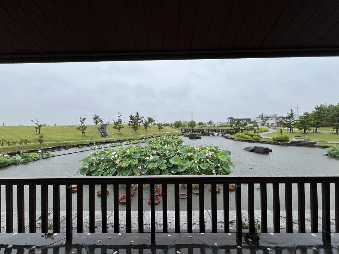 6月18日 水生花園のハスの状況です。今日は雨なので四阿から眺めた風景です。