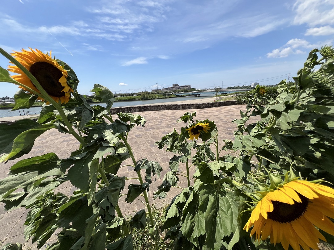 自然ふれあい生態園 護岸近くの花壇です。油ヶ淵周辺は遮るものが無く時々強い海風が吹きます。倒れそうで倒れずに頑張っているヒマワリの様子です。