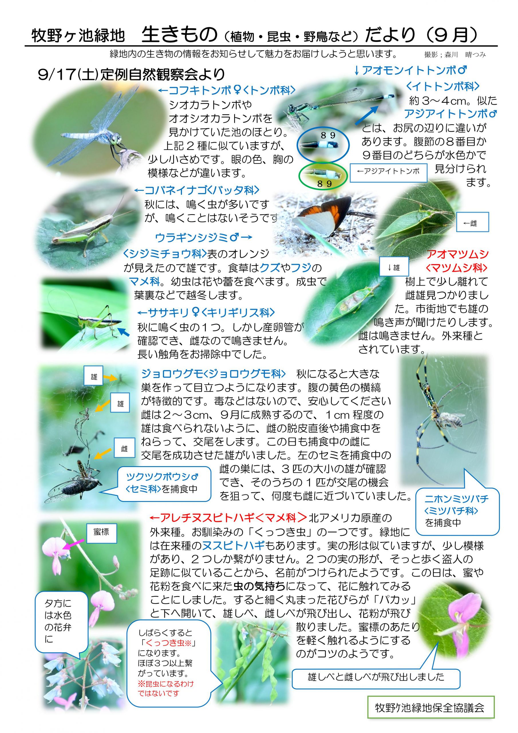 【お知らせ】牧野ケ池緑地 生きものだより(9月)