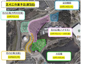 花の広場休憩所周辺と、記念館周辺の芝刈りを下記の日程で予定しております。