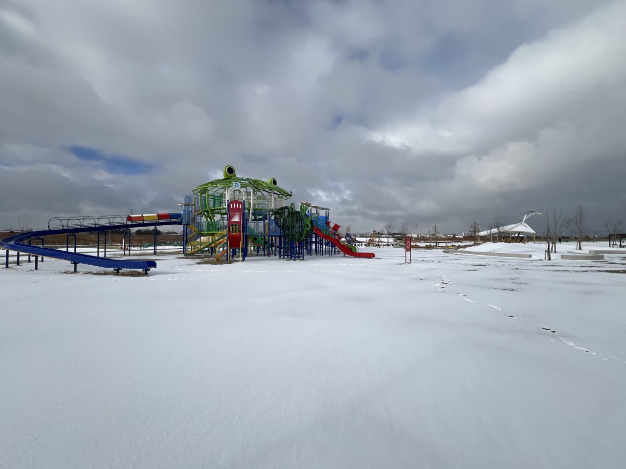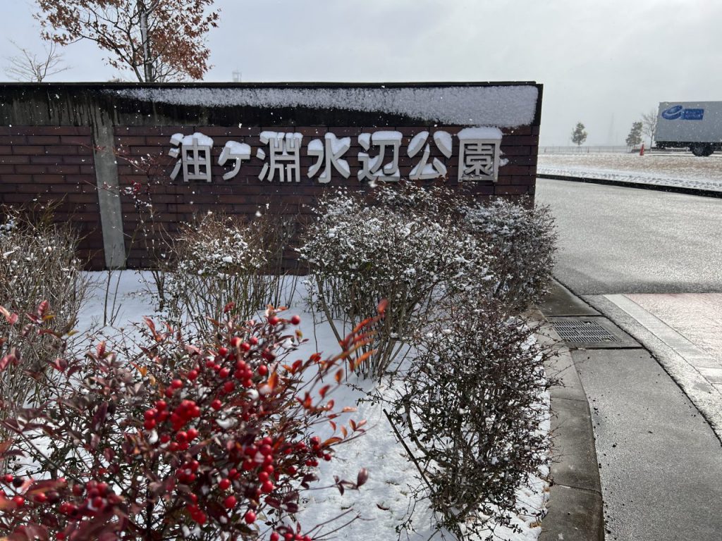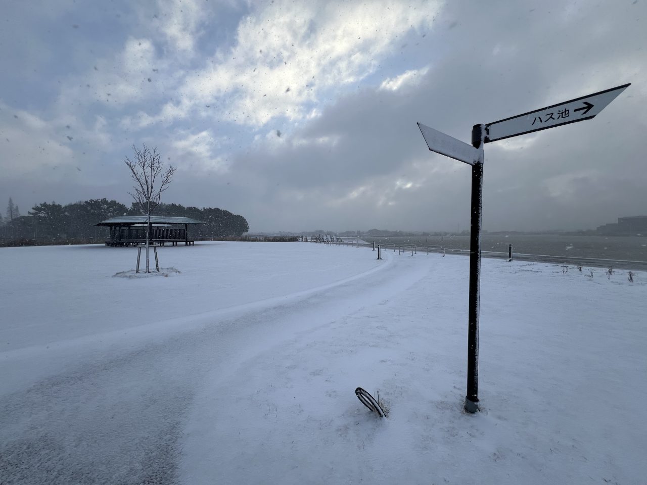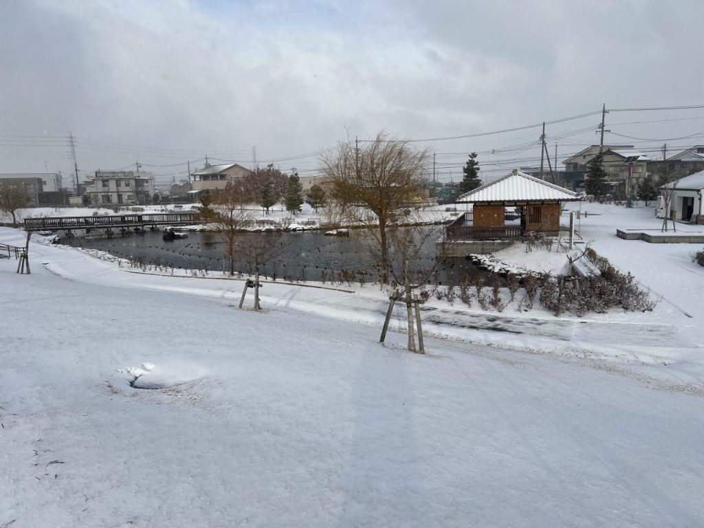 油ヶ淵水辺公園に雪が積もりました。雪景色の公園をご紹介いたします。